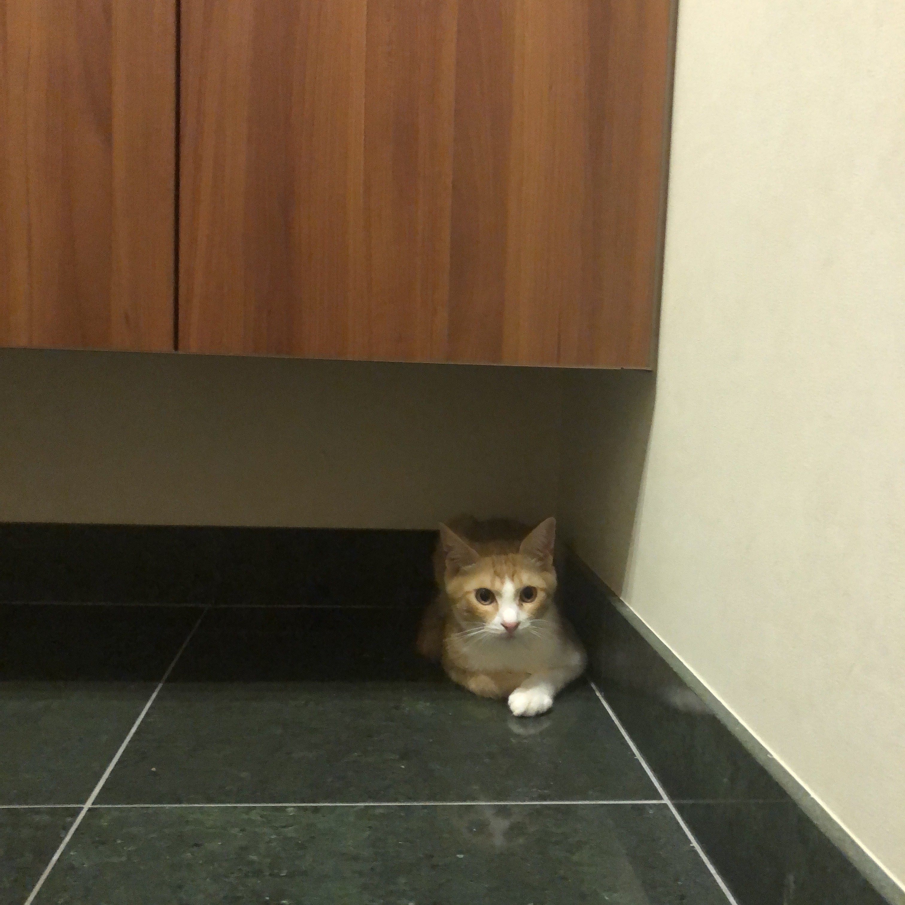 靴箱の下に隠れるまめち。本当に不思議なところに座り込むんですよね〜。