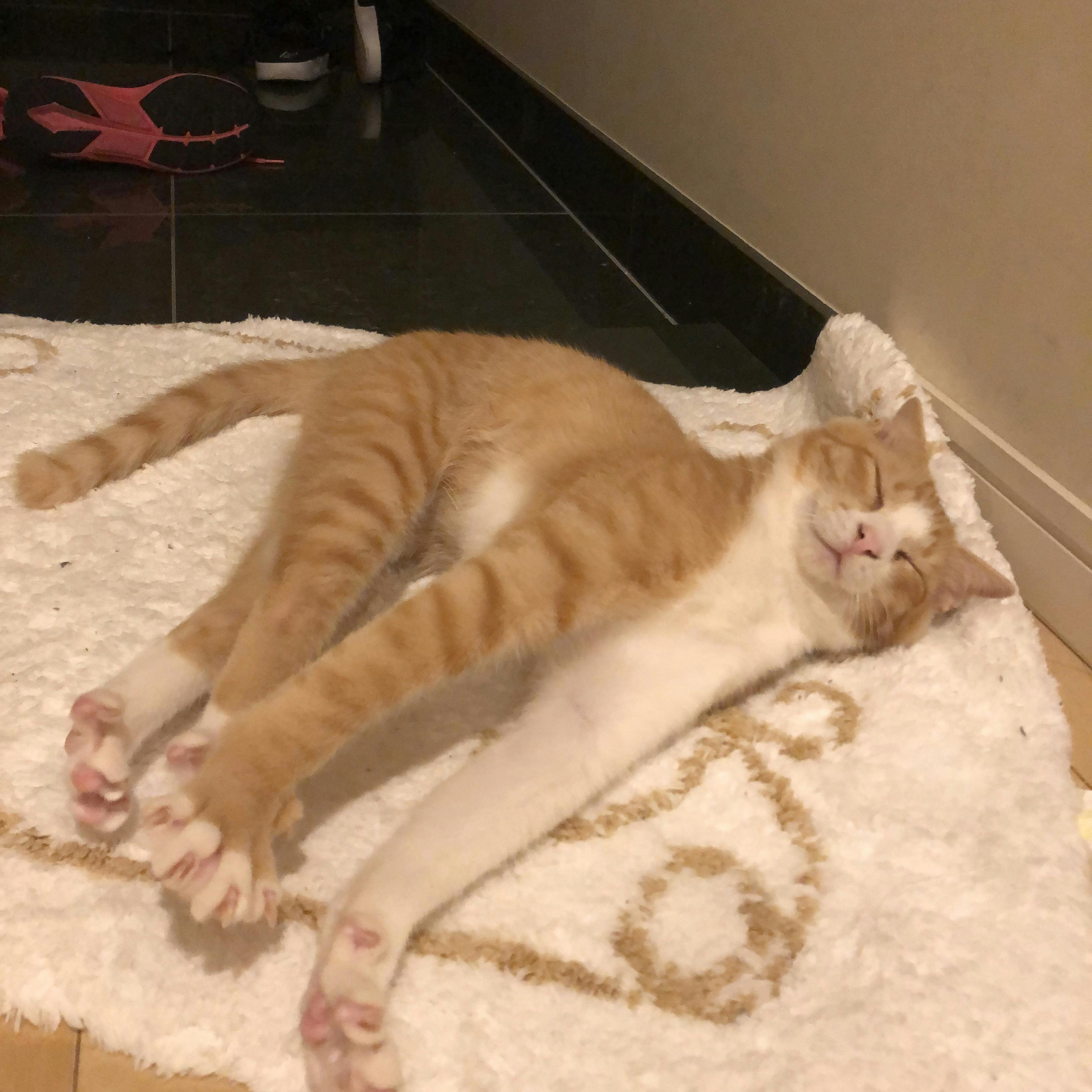トップ画像はお気に入りの玄関マットの上で伸びをするまめちです。このマットが本当にお気に入りみたいで、違うマットを用意しても見向きもしないんです。