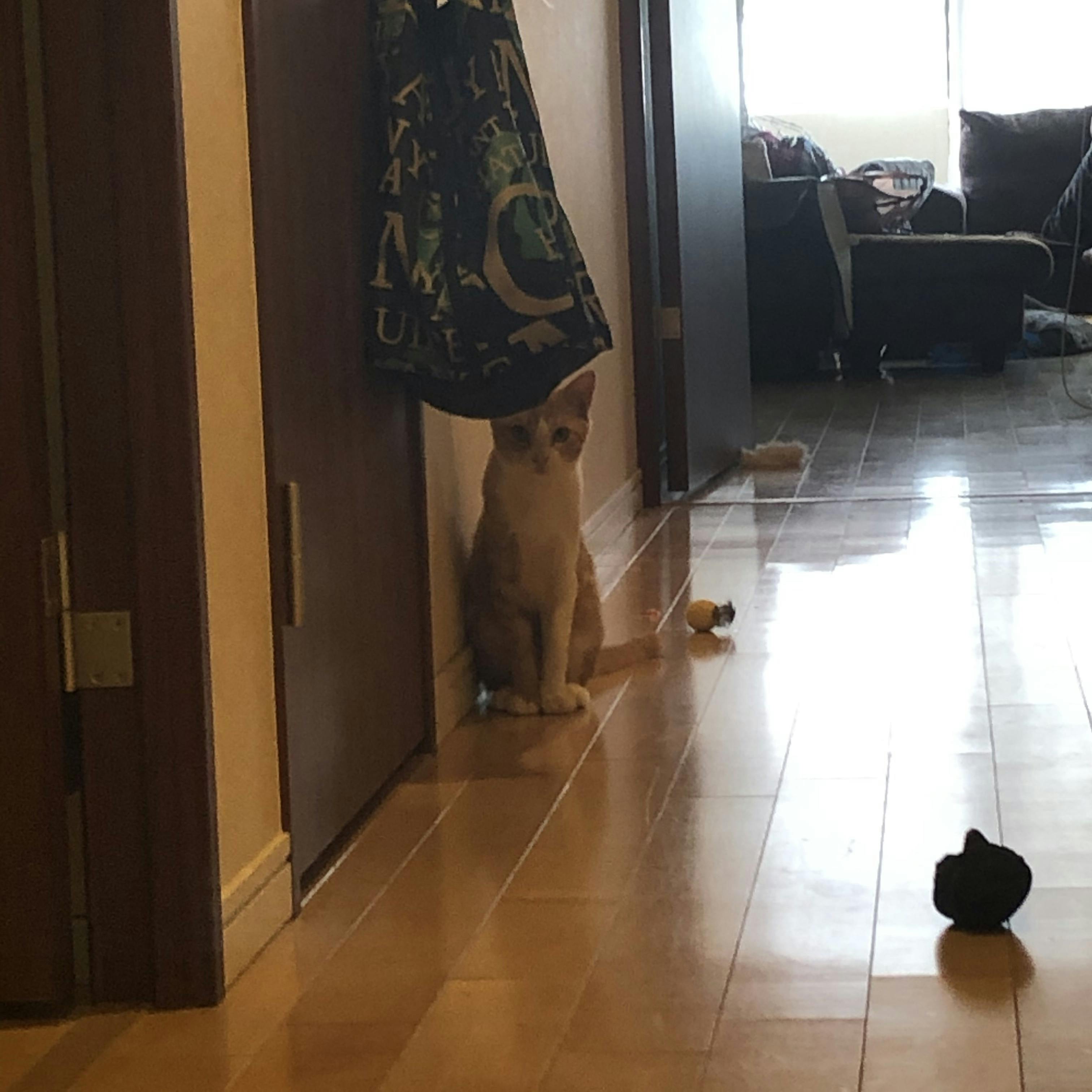 トップ画像は廊下でおもちゃを投げるのを待っているまめちです。