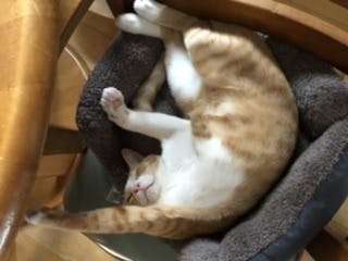 写真は、もう小さくなった冬用のベッドを洗おうかすてようか迷って椅子の上に置いておいたら、新しい夏用のベッドは居心地が悪いのか、結局この暑さの中
