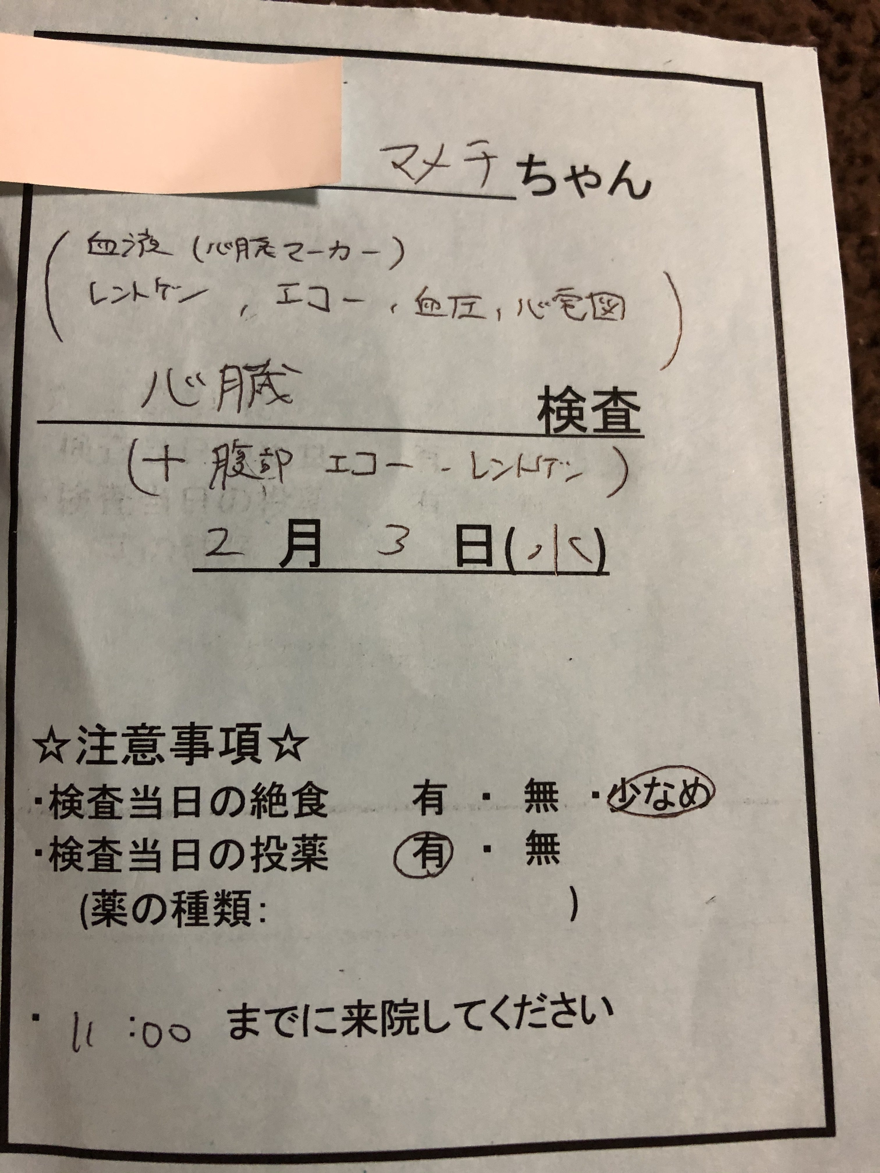また診察の際に「心雑音が気になる」と再び言われたので、来週の水曜日に腹部エコー・レントゲン検査をすることになりました。