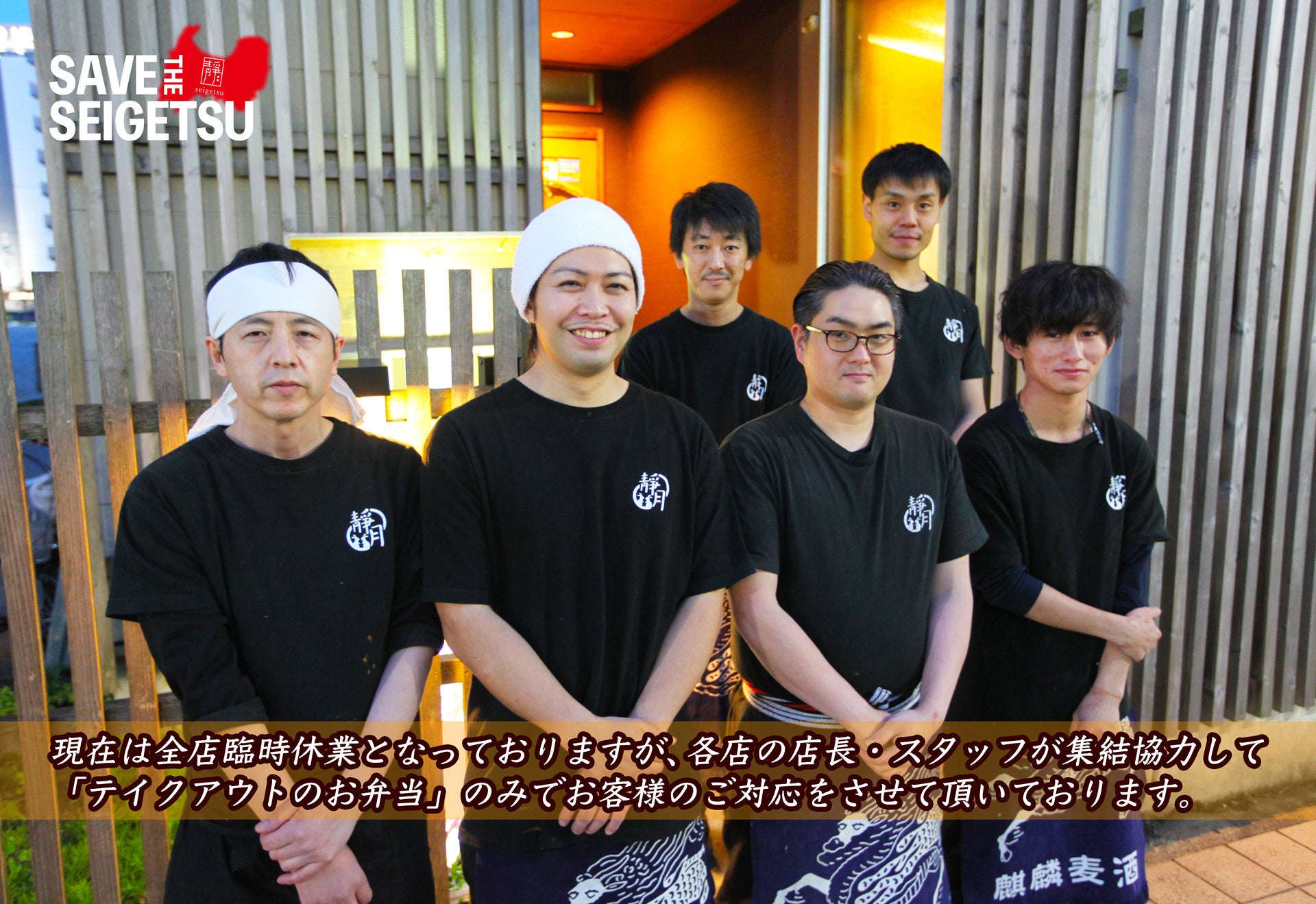 R2.4月の現在は、新型コロナウィルスの感染拡大への防止・自粛のために旬菜 静加と赤ちょうちん せいげつの2店舗は臨時休業とし、創菜酒楽 靜月1店舗のみにて「テイクアウトのお弁当」を企画・販売という営業形態で小規模自粛運営を継続しております。