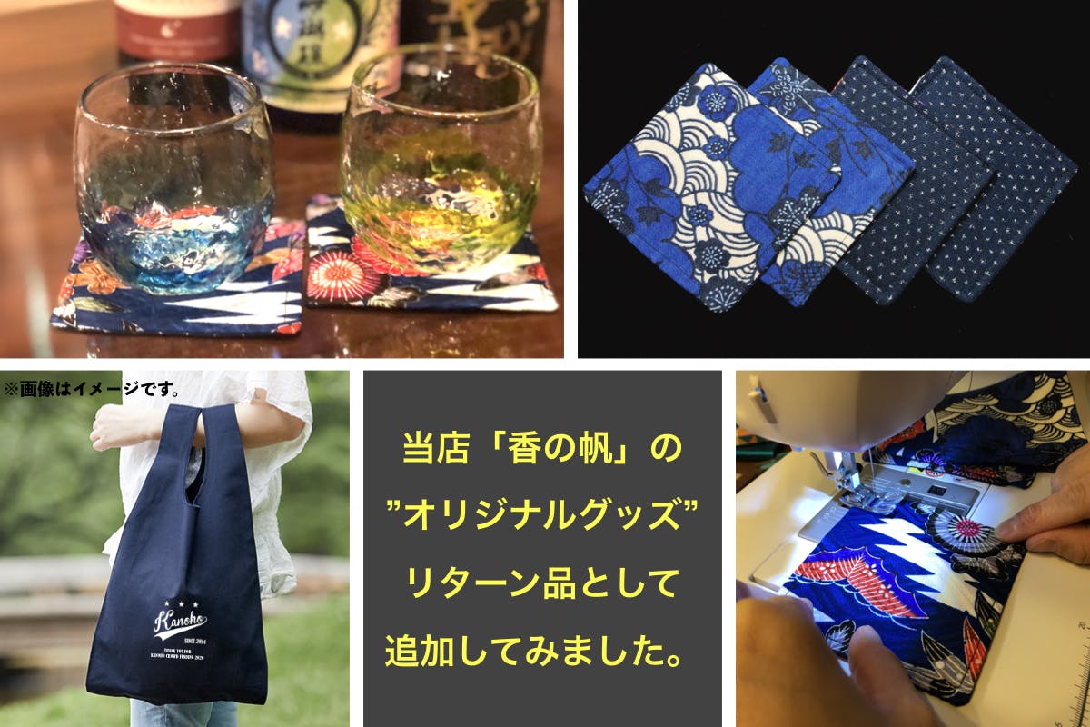 当店女将お手製の沖縄柄コースターをはじめ、琉球グラス・琉球ガラスの箸置き・"香の帆オリジナル"ショッピングバックなどご用意しました。