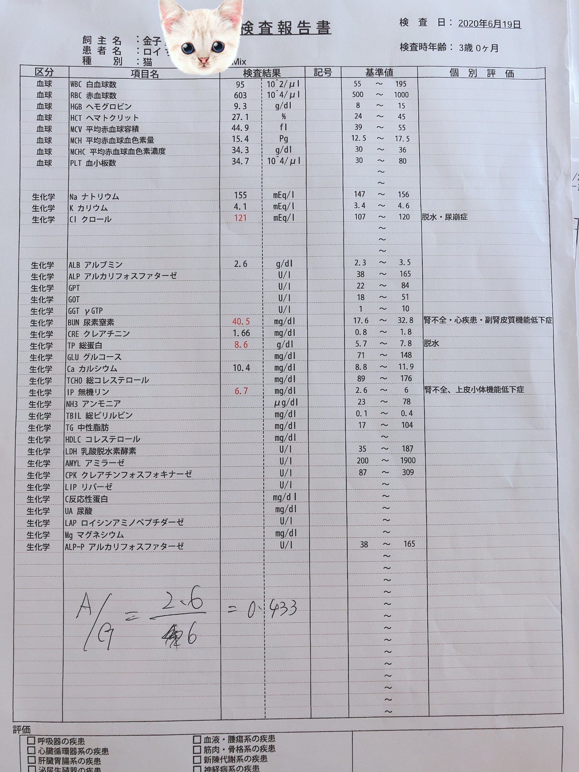 肝心のA/G比ですが、今回は0.433でした。前回より微増したもののまだ低値でした。0.6を超えることを祈っていたのでとても残念です。