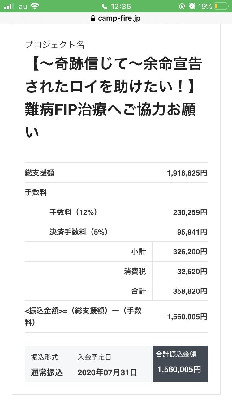 CAMPFIREよりプロジェクト明細が届きましたので、これまでの治療費のまとめとともにお知らせさせていただきます。