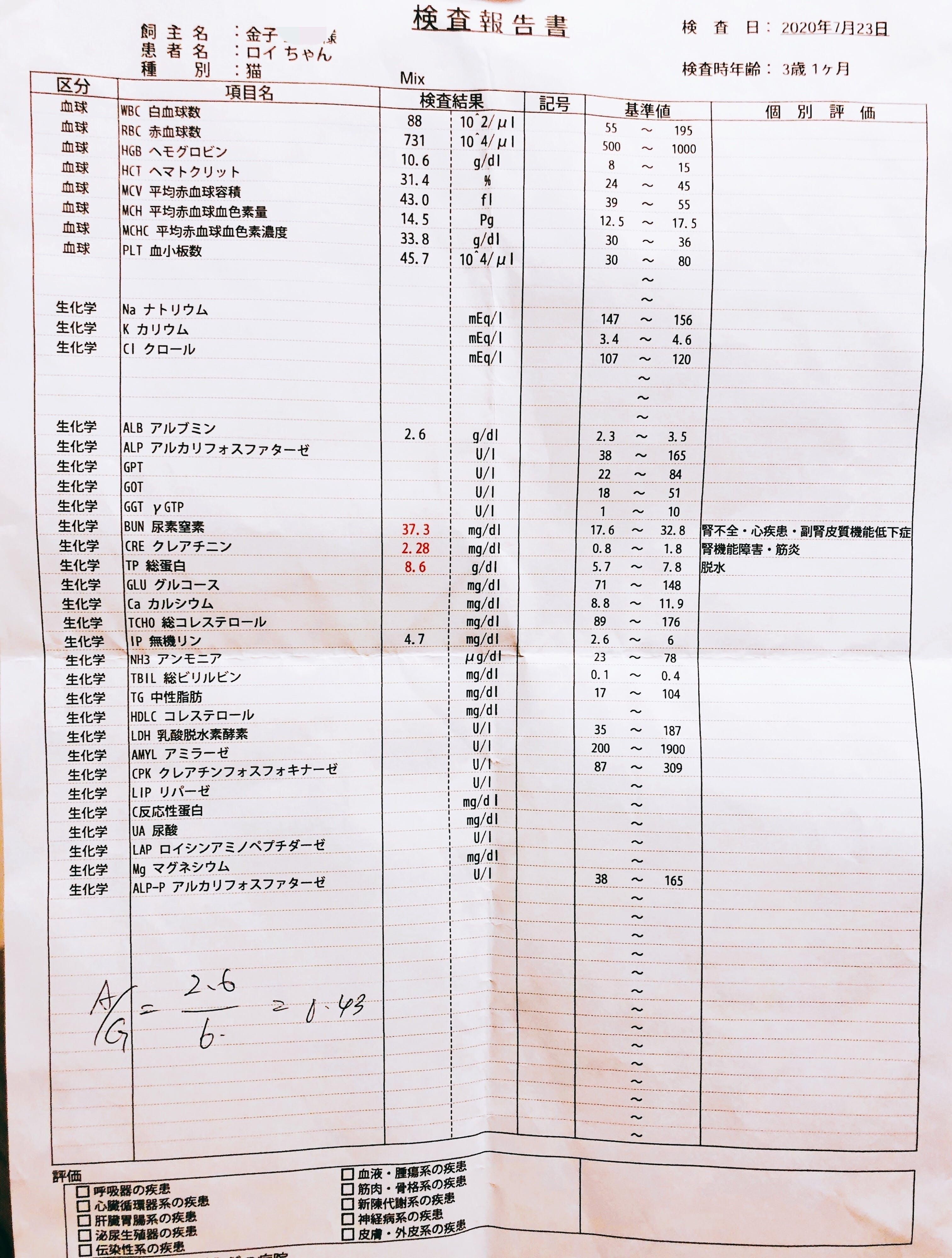 これまでA/G比が低いながらもグロブリンの値は徐々に下がってきていました。先生からはロイの年齢なら少なくとも5を切らないと厳しいと言われていて、前回が5.3だったのであともう少しだったのですが、今回は逆に6.0まで上がってしまいました。グロブリンが高いということはFIPが残っている可能性が高いということで、この結果を聞き只々茫然としました。