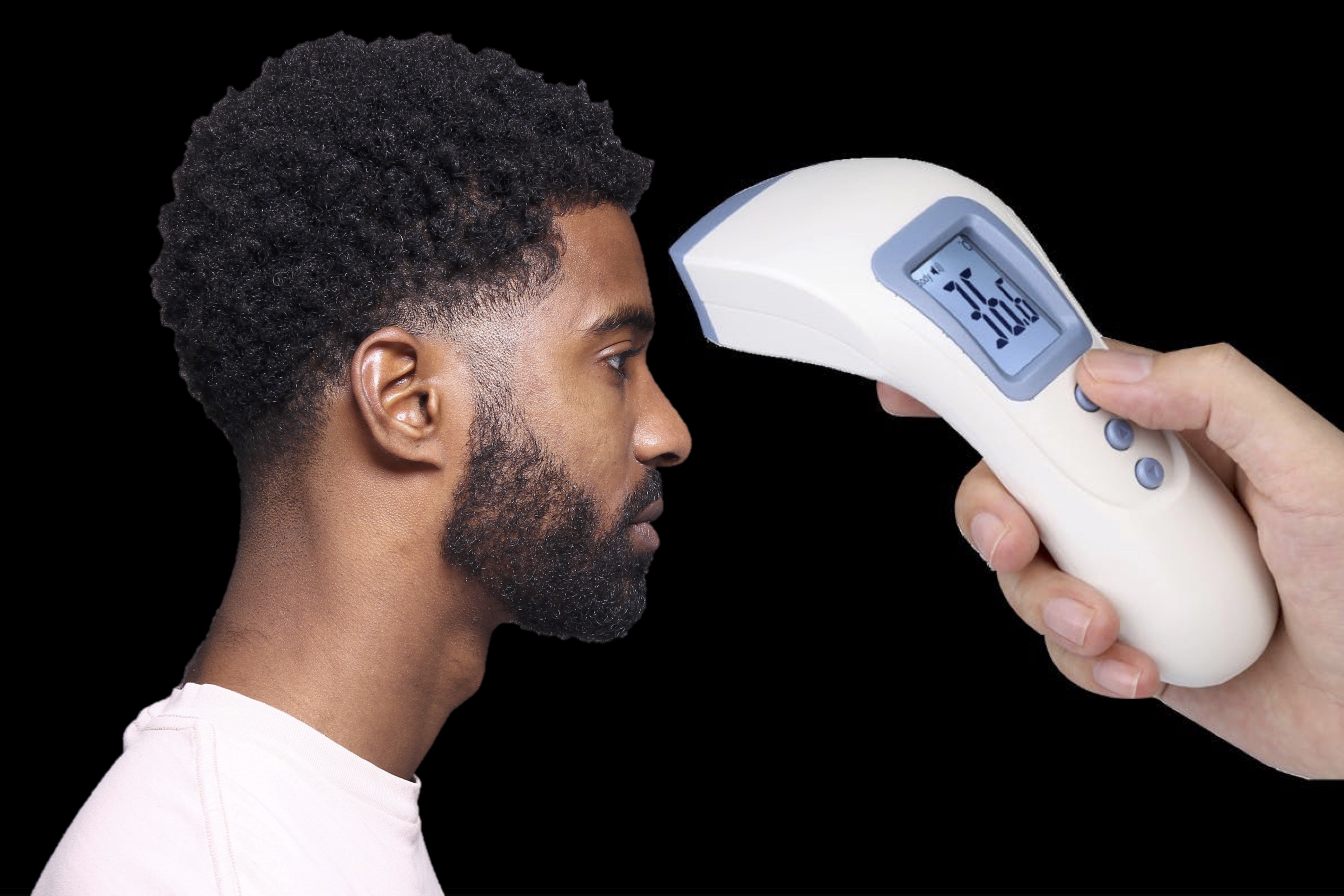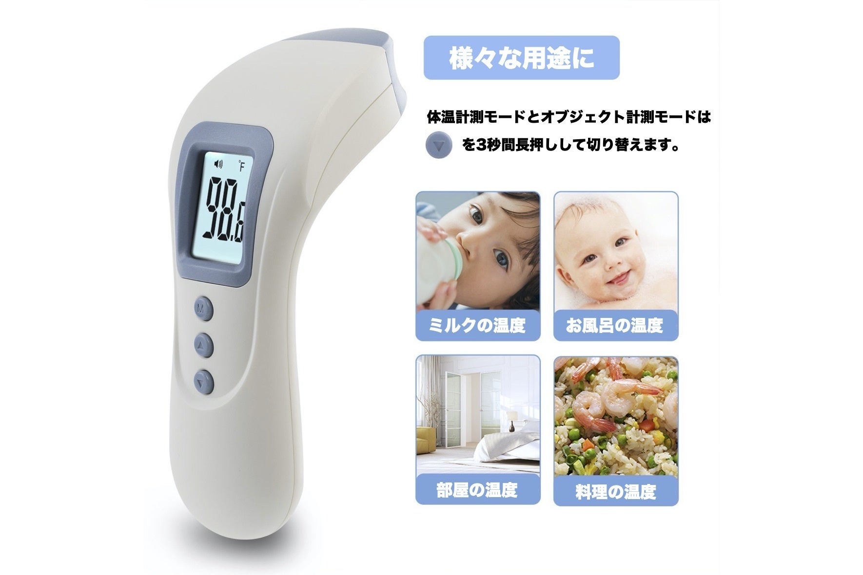 脇に挟む体温計や、耳に当てる体温計とは全く異なります。非接触でおでこに赤外線を当てるだけで体温を計測できます。体温だけでなく、気温、物体、液体など様々な温度を測ることが可能です。
