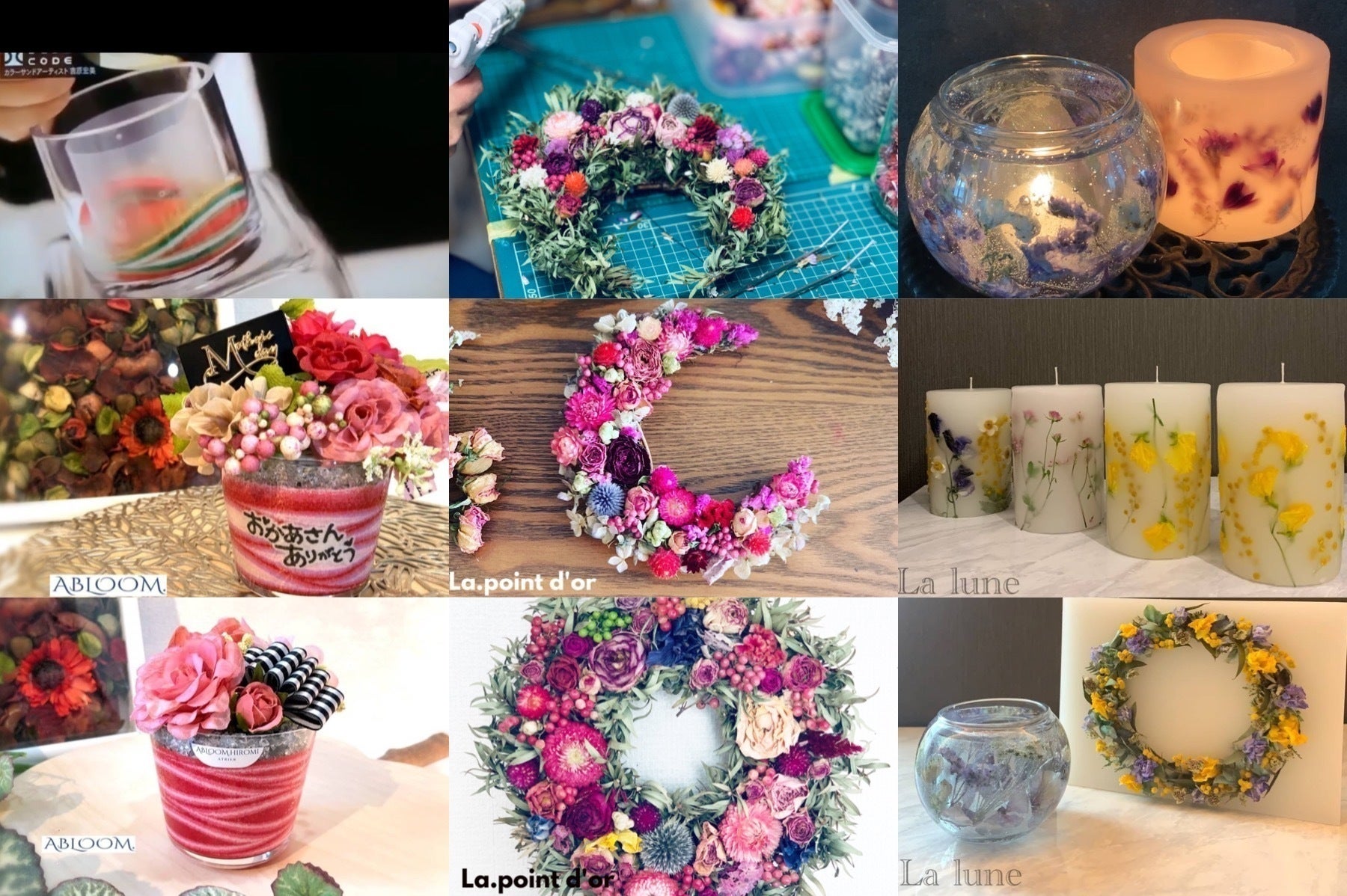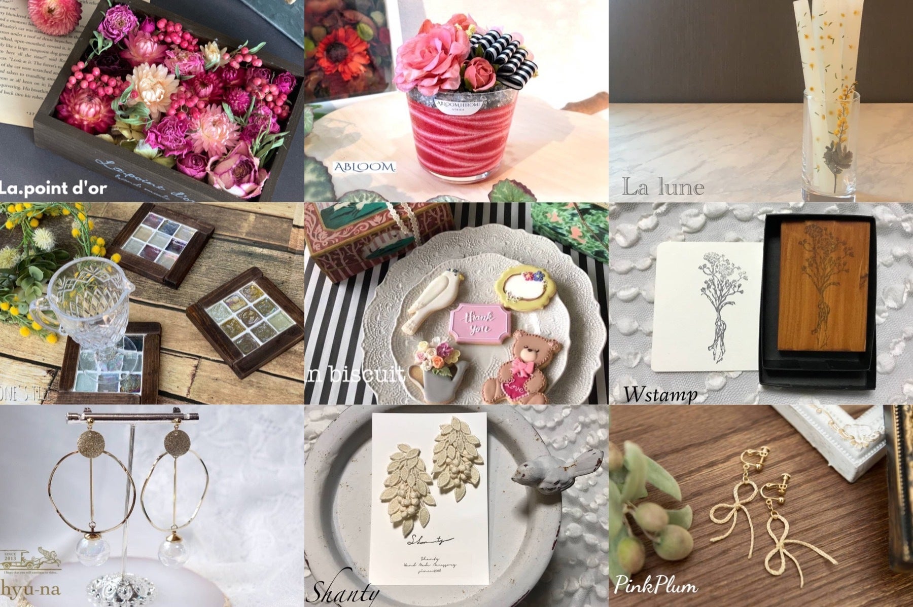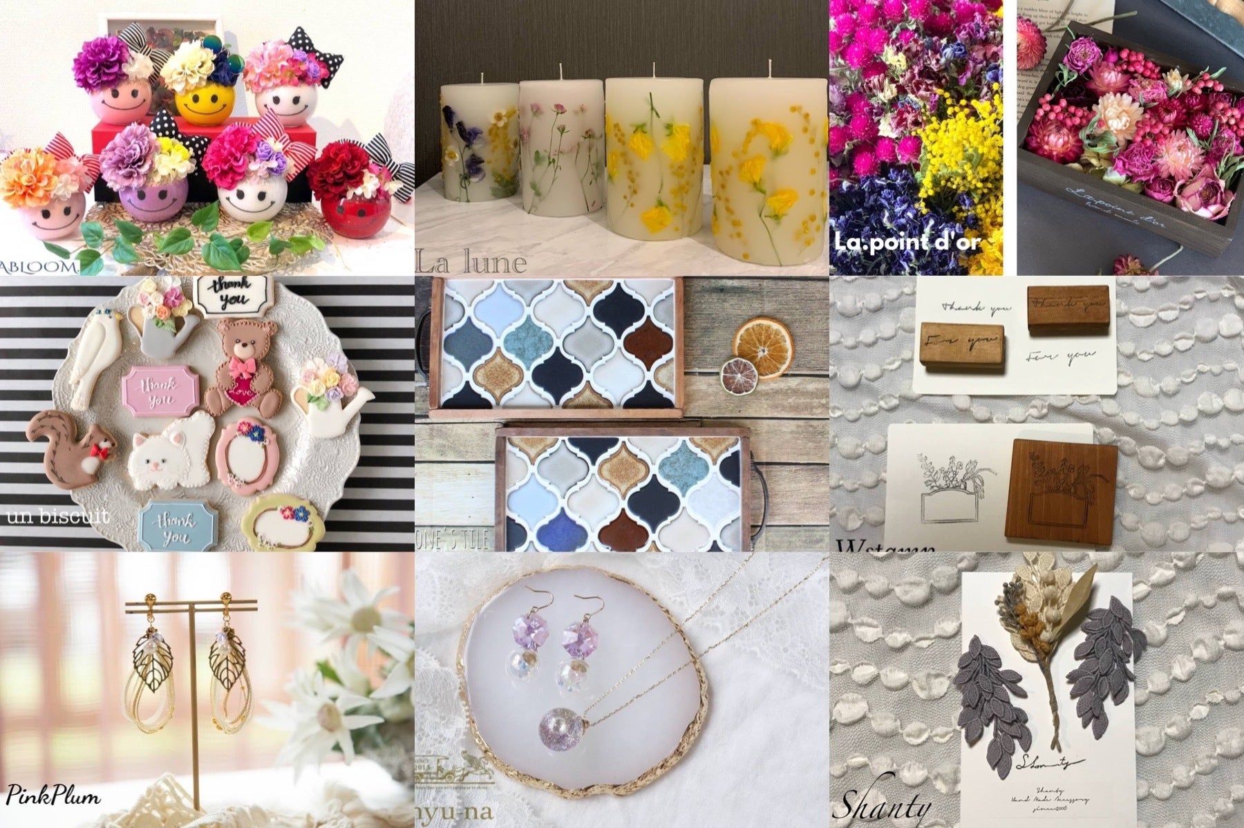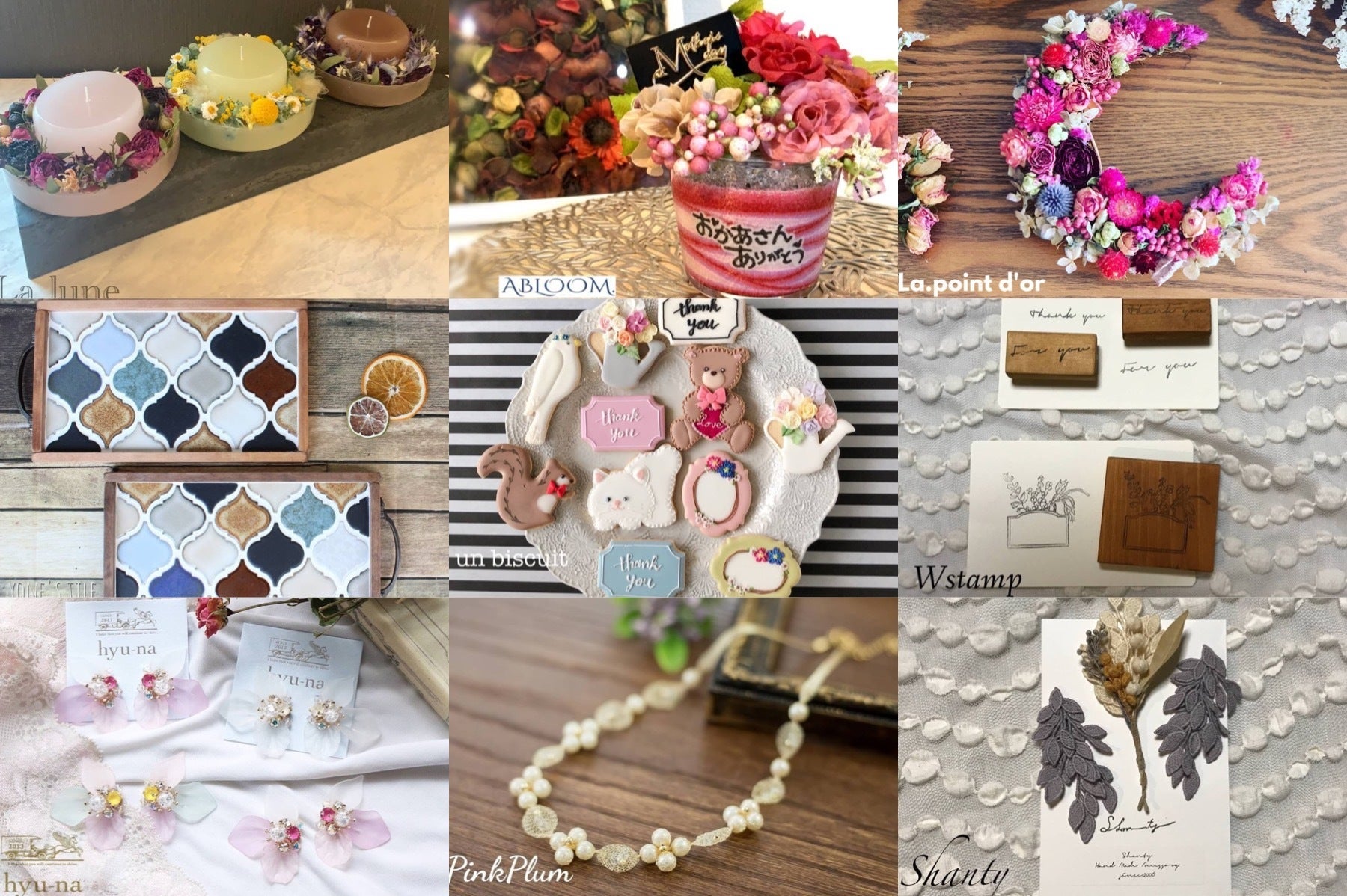母の日に向けて皆様に笑顔になっていただけるような作品を9人のアーティストが(ドライフラワーリース・フラワーキャンドル・カラーサンド・アクセサリー・ボタニカルスタンプ・アイシングクッキー・タイル雑貨など)