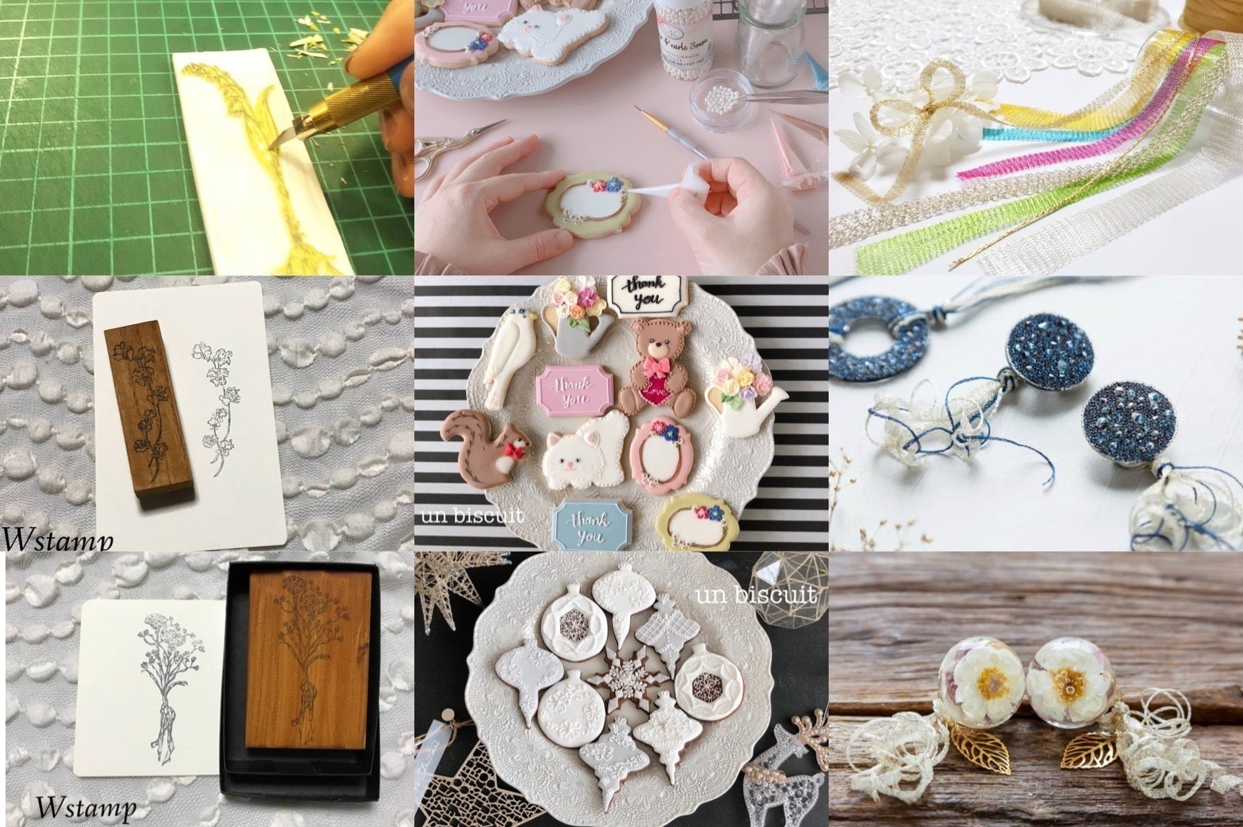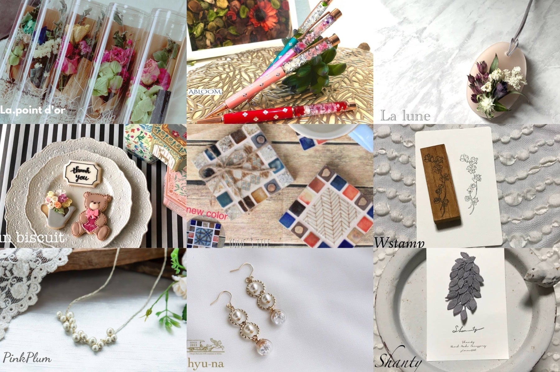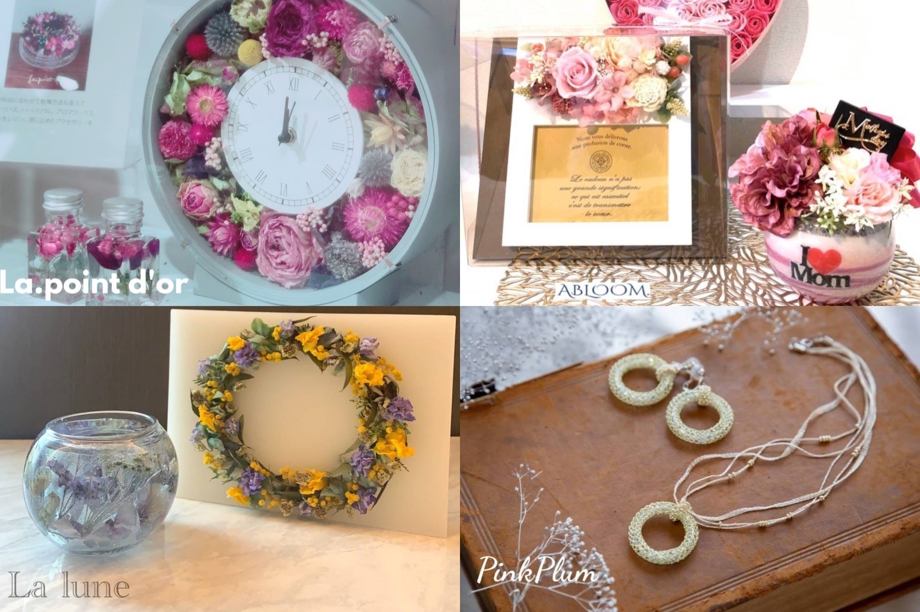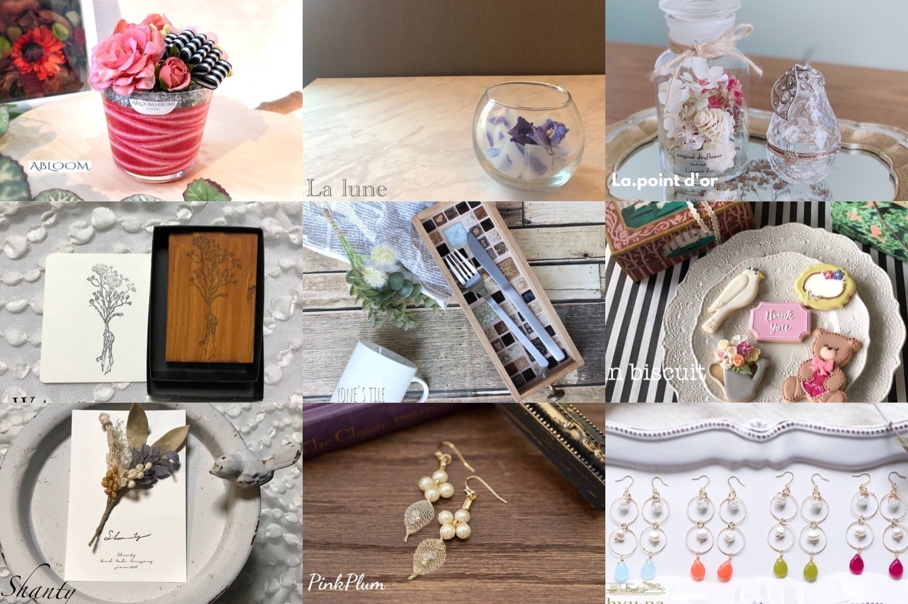 母の日に向けて皆様に笑顔になっていただけるような作品を9人のアーティストが(ドライフラワーリース・フラワーキャンドル・カラーサンド・アクセサリー・ボタニカルスタンプ・アイシングクッキー・タイル雑貨など)