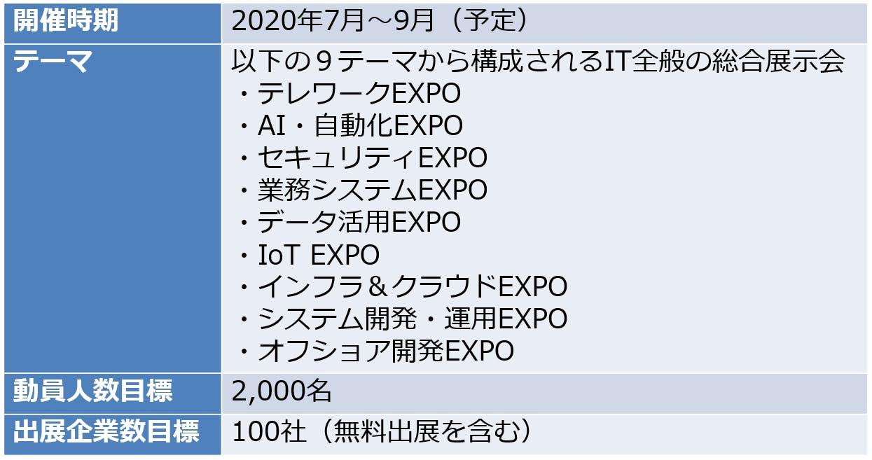 今年の春も、東京ビッグサイトで開催予定だったJapan IT Weekに出展を予定しており準備を進めていましたが、新型コロナウイルスの感染拡大によってJapan IT Week自体が中止になってしまいました。IT企業8社に協賛いただいていた共同出展も、準備していましたが、急遽中止にせざるを得なくなりました。