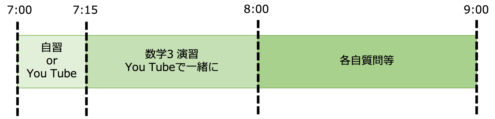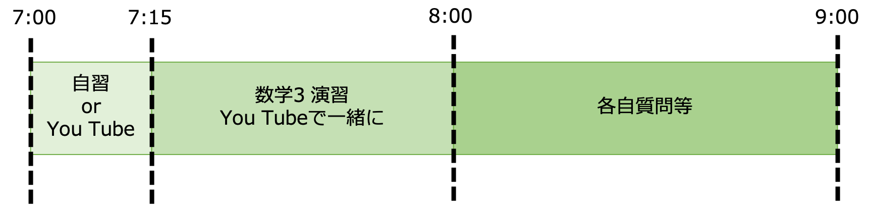 生徒には学習教材としてYouTubeの動画を指定し、事前に動画を見てもらうことにしています。毎朝7:00~9:00の2時間限定で、前半1時間はYouTubeを使った新学期の予習範囲の演習を行い、後半1時間は自習タイムとして好きな問題をといて質問を受け付ける時間にしています。