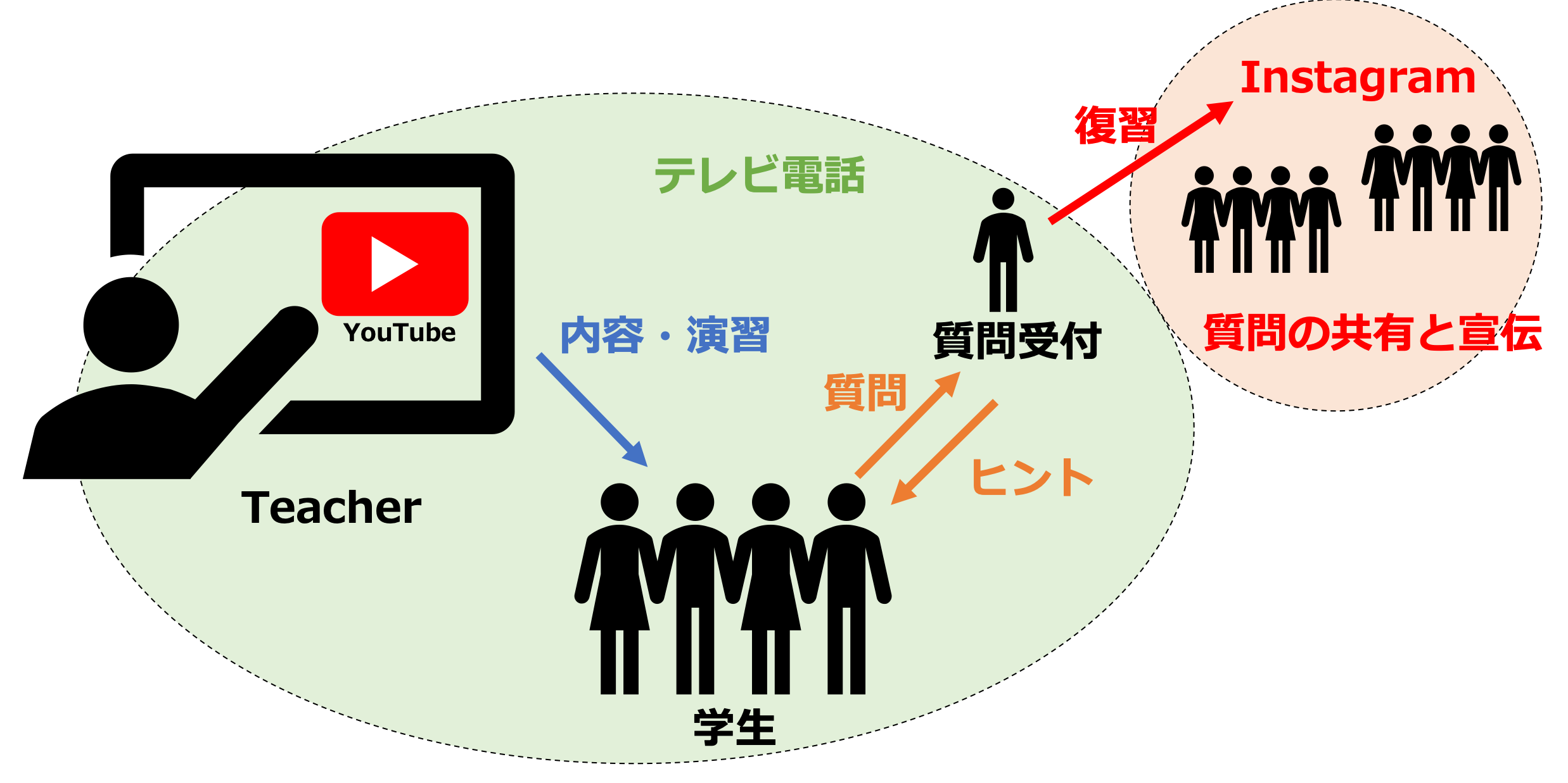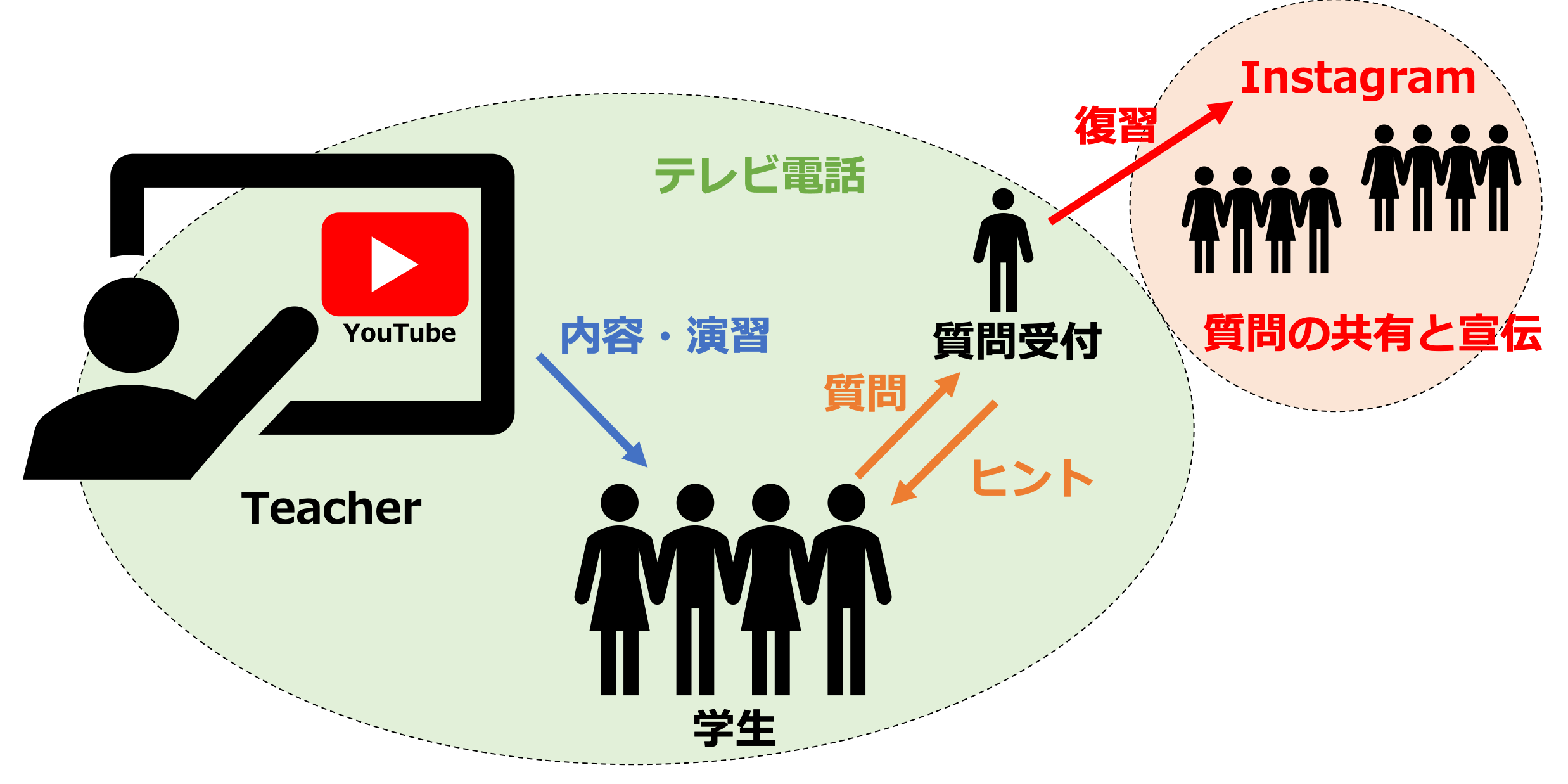 ②が必要な理由、誰かの疑問は自分の疑問と同じだったという経験はありませんか?テレビ電話では他人の質問やその答えを聞くことができ、疑問の解決に繋がっていきます。学年を混ぜることで復習や先のイメージを持てることや、ある学生が質問をした時、それを別の学生が自発的に答え、教える経験を経ることでより定着が進むからです。