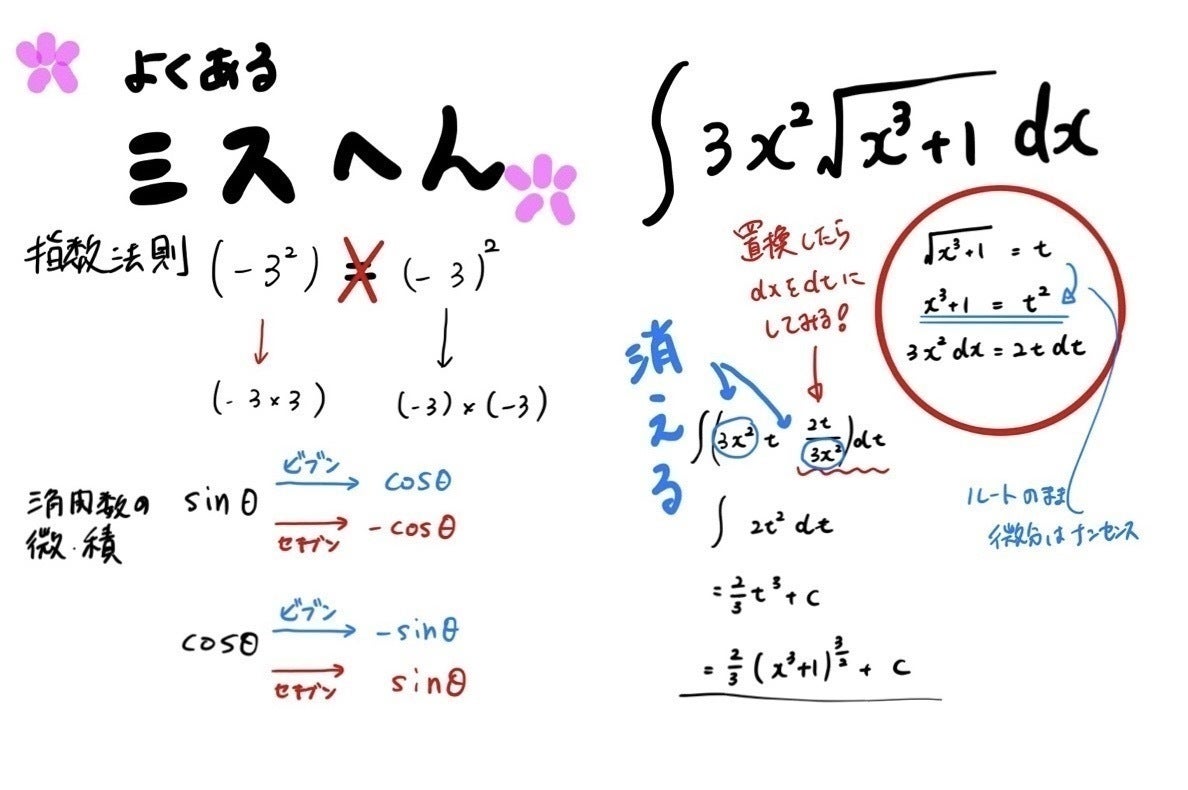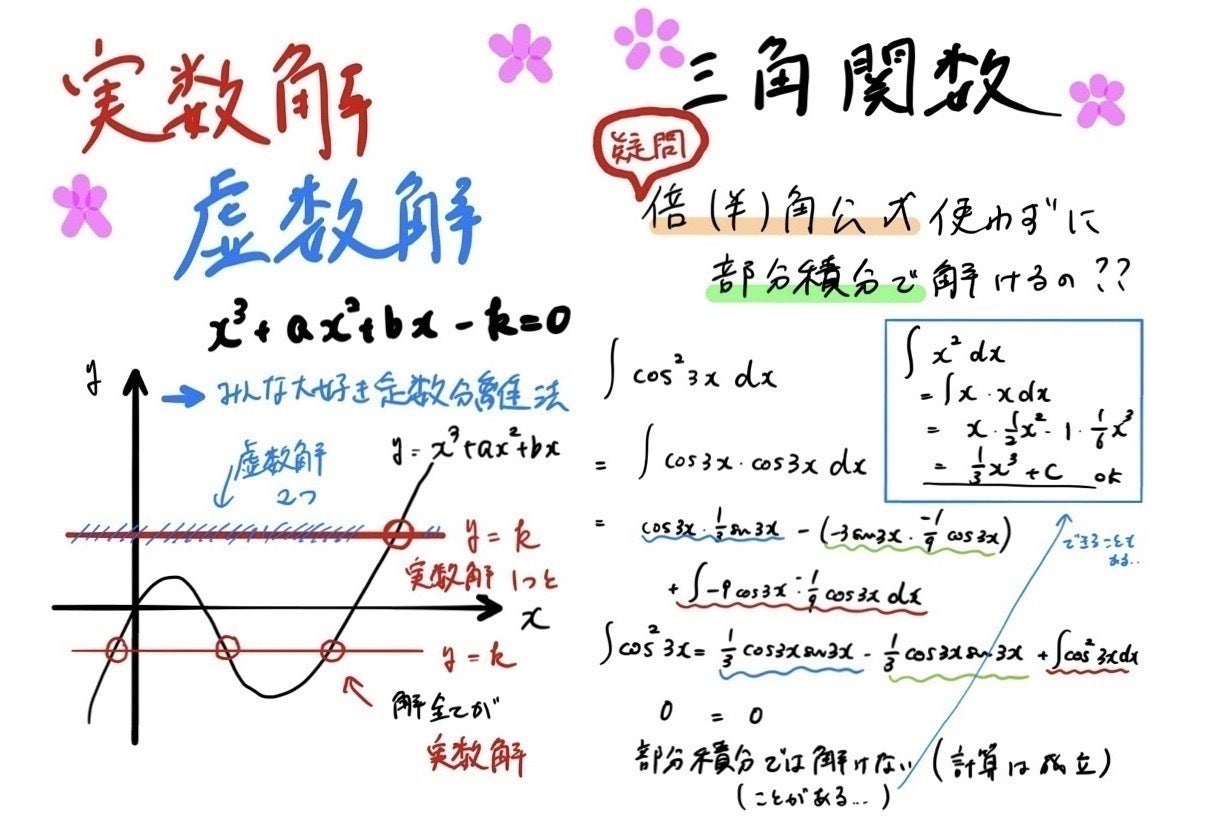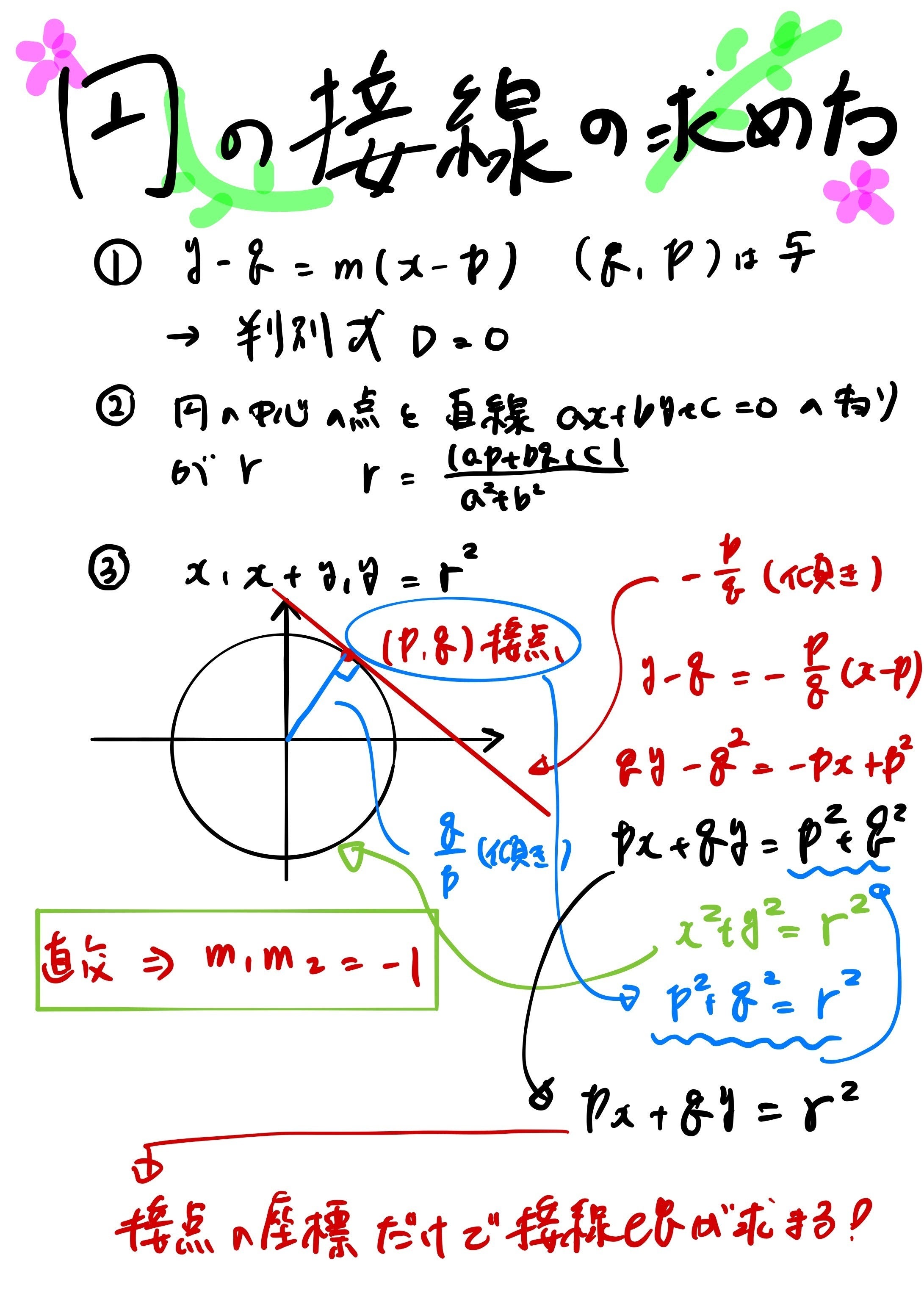 2020/05/03 08:55高校の数学で円の接線の求め方には3種類あると紹介されています。与えられた条件から最適な方法を選ぶことでより速く、的確に解くことができるというのが狙いです。本日はその中でも、図の3番目に当たる円の文字式の片っぽだけに接点の座標を代入するだけで接線の方程式に生まれ変わるという最強装備について解説しました。この武器は理解して味方につければ頼りになるが、あやふやな状態で使うとかえって間違ってしまいます。簡単な理由から導かれているので、こういう考え方から成り立っているんだという部分から導かせてあげることができました。 もっと見る