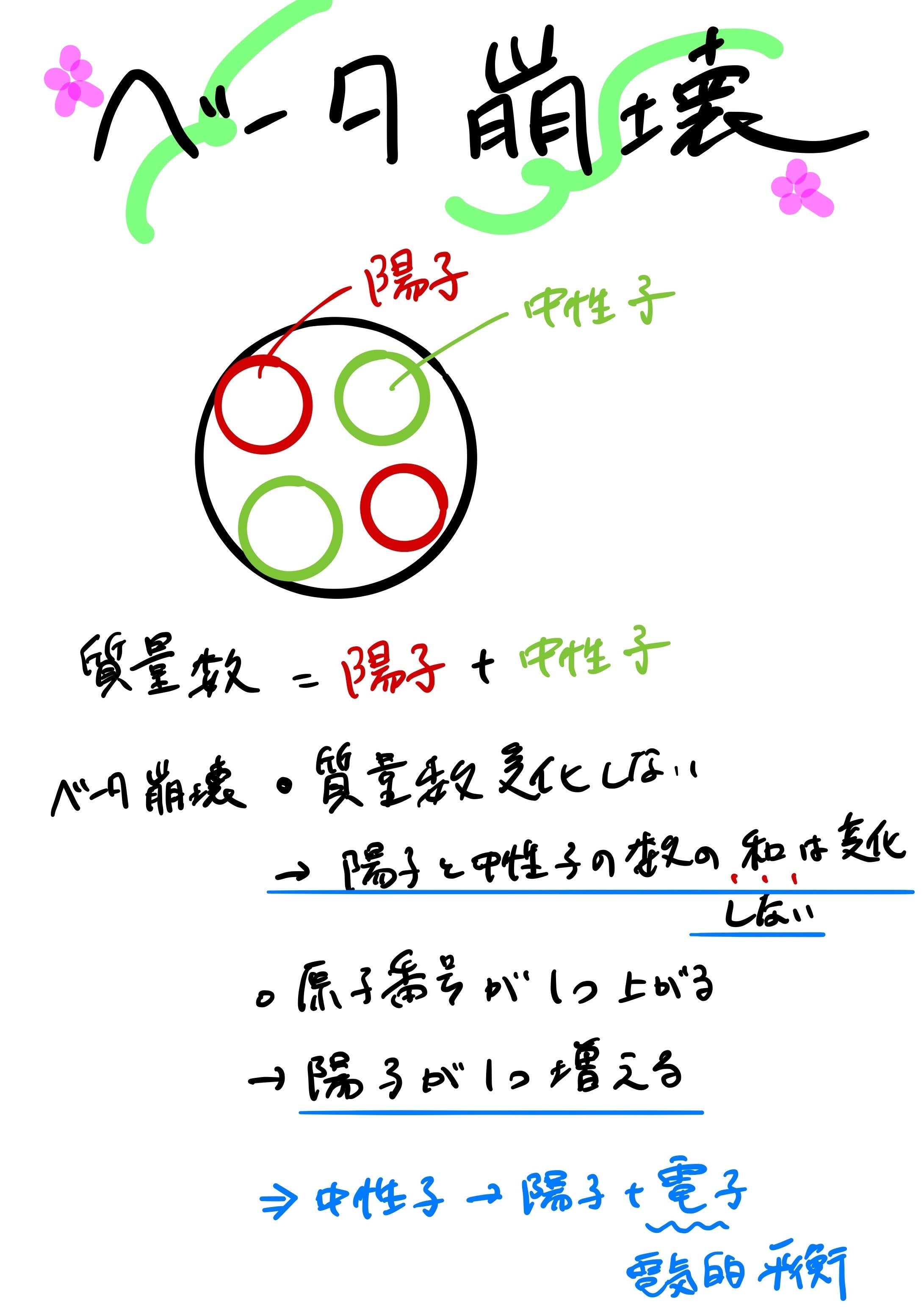 2020/05/03 09:07ベータ崩壊について事実と考察に分けて解説をしました。事実としてベータ崩壊では、・質量数が前後で変化しない・原子番号が1つ上がるという事実から考察すると、1つの中性子から陽子1つと電気的平衡を保つため電子1個が発現するのではないか?という点で議論しました。その他、半減期の微分方程式を高校の範囲外ではありますが、数3の積分の知識をこの朝活で予習できていたので、一緒に解きました。学問は特に数学は他の学問と繋がっているので学習の進捗が重要だと改めて思った次第。 もっと見る勉強できたこと5/2