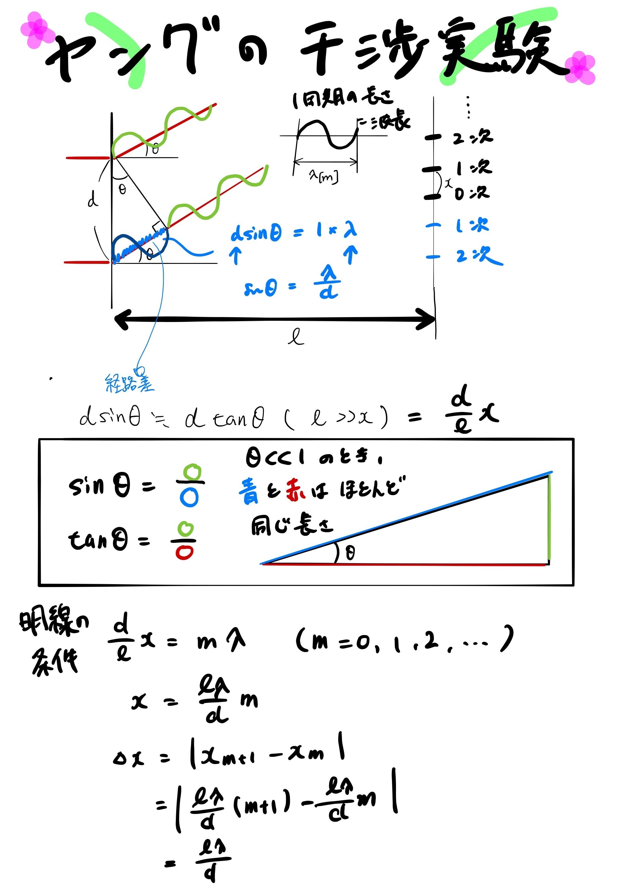 2020/05/05 10:12光のヤングの実験に関する予習を行いました。波動の分野はすでに履修済みであったので、回折角などの固有の言葉とその定義から求め方を取り組みました。波動の分野を履修していた分、取り組みやすいものの角度の近似などで混合するところも多いので予習が大切だと思いました。 もっと見る勉強できたこと5/3