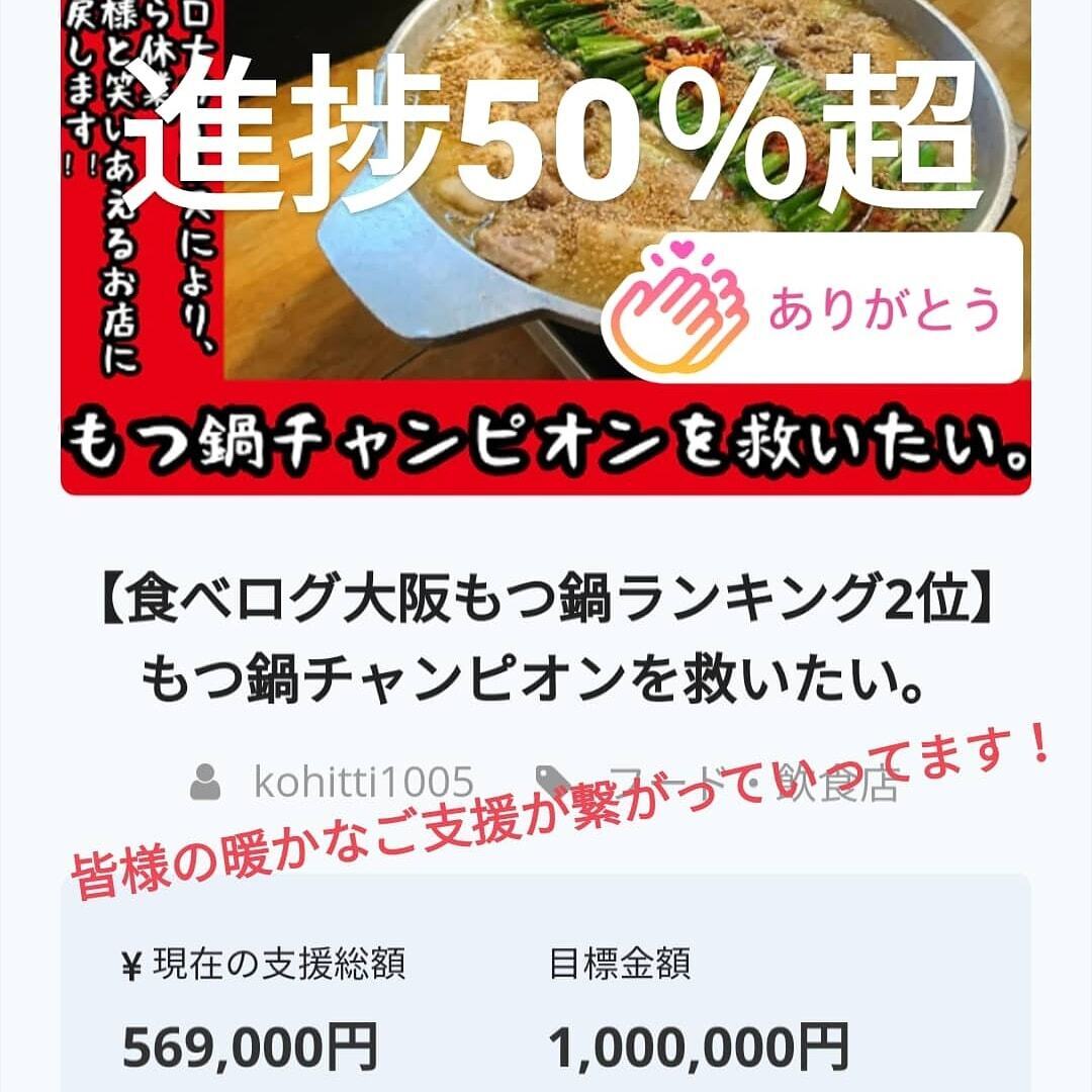お世話になっております。もつ鍋チャンピオンの小野寺です。皆様の多大なるご支援により、活動3日間で50%まで進捗致しました。改めて感謝申し上げます。メールにてご連絡させて頂いた方もいらっしゃいますが、活動中においては、皆様の個人情報は運営に管理され、終了後に私に運営より渡されることとなっております。ですので、一人一人にご連絡することが現状難しくなっており、終了後改めて御礼の連絡と、商品の配送日の打ち合わせをさせて頂ければと思います。ご支援頂きました皆様にもコロナの影響は大なり小なりある中、暖かなご支援頂けること、スタッフ一同大変感謝しております。このご支援を無駄にしないように、引き続き、笑いあえるお店に戻す活動を続けてまいります。最後までお読み頂き有難うございました。