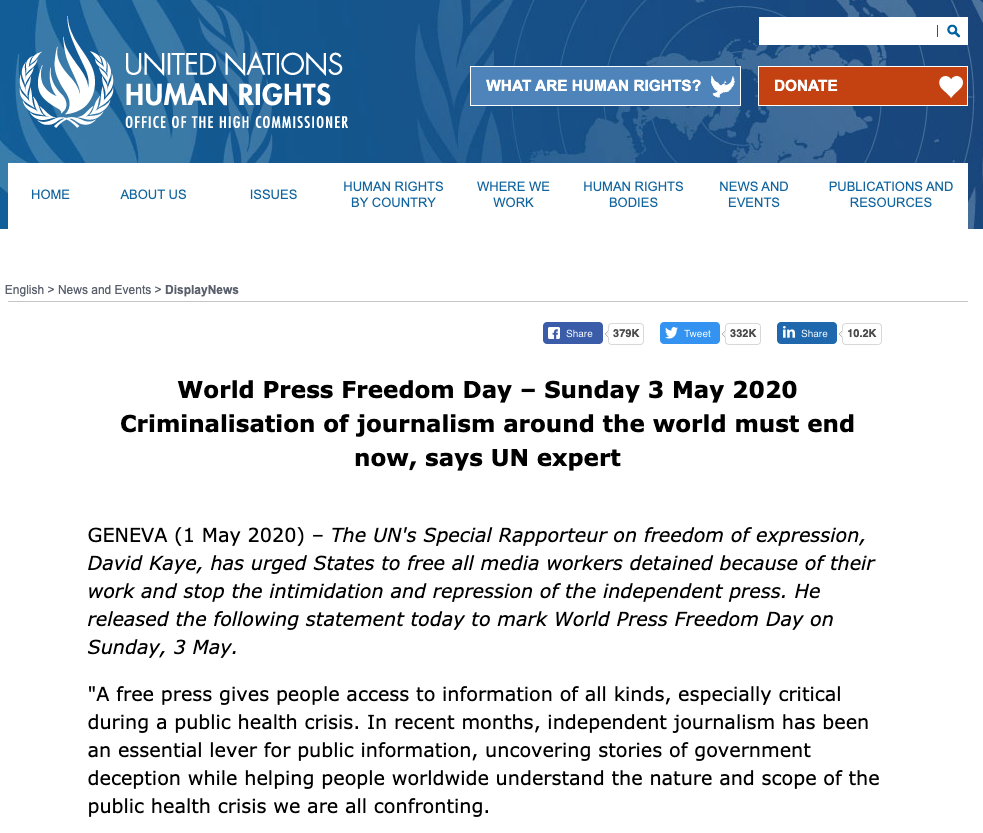 「自由な報道は人々にあらゆる種類の情報へのアクセスを与える。公衆衛生上の危機の際には特に重要である。ここ数ヶ月、独立したジャーナリズムは、政府の欺瞞を暴き、世界中の人々が私たちに直面している公衆衛生危機の性質と範囲をわかりやすく伝える一方で、公共情報を提供するための不可欠な手段となっている。