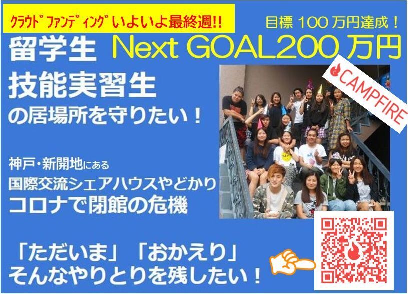 2020/06/30 23:00やどかりを応援してくださったすべてのみなさまへ今回のクラウドファンディングを通して初めてやどかりのことを知ってくださった方、そして以前からやどかりを支えてくださっている方々、本当にありがとうございました。目標を達成し、無事クラウドファンディングを終わりを迎えます。2020年1月から「このままでは危ない」と思い、3月4月に「もうだめだ」と思い、一時は閉館の準備もしていました。しかしたくさんの方が「あきらめてはいけない」と物件探しを手伝ってくださったり、情報をくださったり、本当にやどかりのことを思ってくださいました。「私たちがここであきらめていいのか」そう再び思えるように力を貸してくださいました。クラウドファンディングは終了しますが、やどかりの正念場はここからです。皆様に守っていただいたやどかりを守り続けなければなりません。今後もどうかやどかりを応援してください。今後の活動はやどかりのfacebookでチェックしてください!→https://www.facebook.com/kobe.yadokari/ やどかりの宿泊リターンを通してご支援くださった皆様、お会いできる日をスタッフ一同心からお待ちしております。留学生の進路をサポートするリターンを選んでくださった皆様、やどかりスタッフが責任をもって留学生たちに手渡します。その様子はぜひfacebookでご確認ください。zoomコンサートを選んでくださった皆様、7月にオンライン上でお会いできるのを楽しみにしております!「やさしい日本語の使い方講座」や講演のリターンを選んでくださった皆様、会場でお会いできるのを楽しみにしております。そして、約60日にわたりクラウドファンディングを支えてくださったすべての皆様、本当にありがとうございました。心から御礼申し上げます。たくさんの方に温かく見守っていただき、とっても幸せです!明日から7月です。7月1日でやどかりは6歳になります!皆様のおかげで無事6年目をスタートすることができます。今後ともどうぞよろしくお願いいたします。暑くなってまいりますので、どうか皆様ご自愛ください。国際交流シェアハウスやどかり スタッフ一同 もっと見る留学生や技能実習生に伝えたいこと