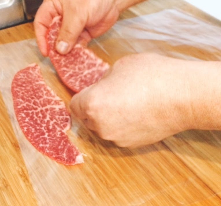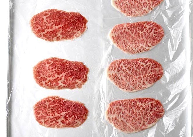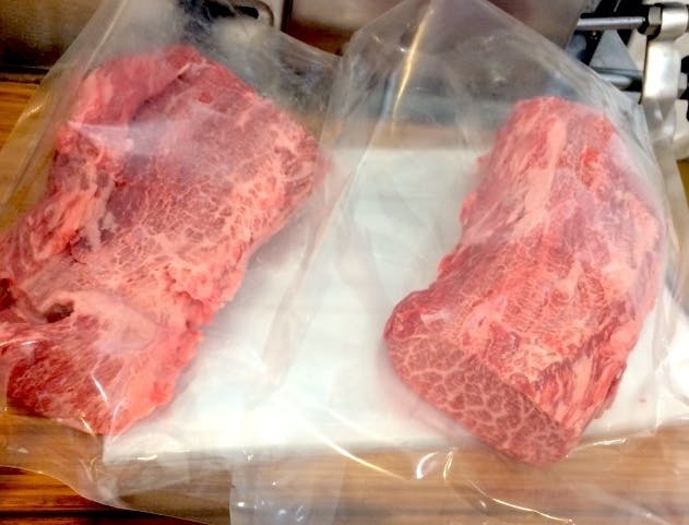 基本冷凍はせずに真空パックにします。つまり牛肉は空気を遮断してしまうとあっという間に色が沈んできます。真空パックから出して冷気に触れると美しい赤みが戻ってくるのですが薄切りのお肉を提供する場合、お肉の縁の部分までどのくらい回復するのか日々研究です。未だはっきりと答えが出ません。隅々まで美しく蘇った時と全く同じようにしても縁が回復しきれない時も正直あり...。そんな時、改めて『生き物』を意識します。そして、扱えると思い込む傲慢さを反省します。繰り返し繰り返し肉と向き合います。