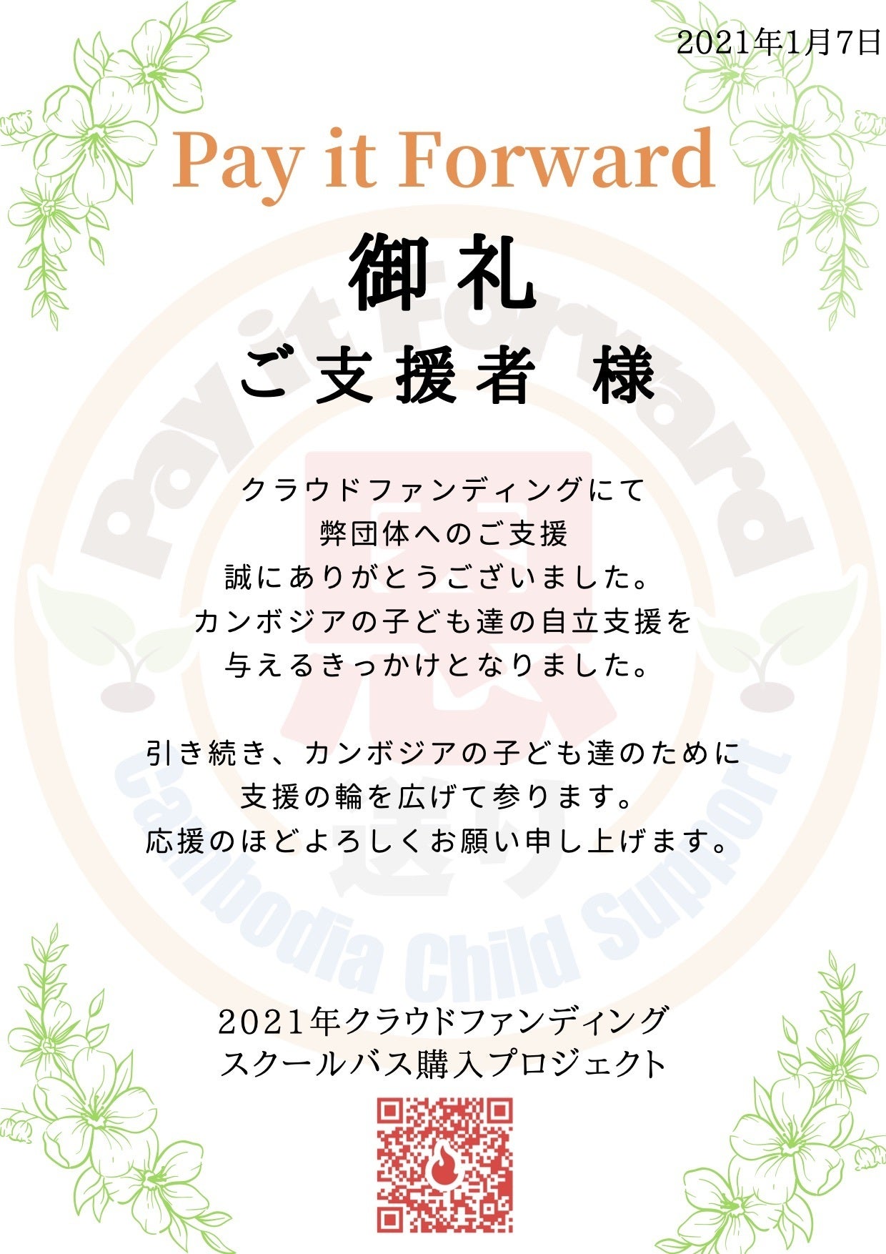 2021/01/08 09:30皆様、あけましておめでとうございます。本年度もよろしくお願い致します。Pay it Forward の加藤です。昨年度はみなさまのご支援誠にありがとうございました。みなさまのご支援により、弊団体の活動継続とカンボジアの子ども達の生活を守ることができました。ご支援いただきましたみなさまの元へ返礼品を発送いたしました。大変お待たせいたしました。数日程でお手元に届くと思いますので、お待ちください。【カンボジアのコロナウイルスについて】2021年に入り、カンボジア国内でのコロナウイルス感染拡大を抑え込むことができており、弊団体の支援する子ども達には影響は出ておりません。しかし、昨年と同様、他国からの外国人訪問がないため、直接的支援がございません。弊団体が一番大切にする、” 教育 ”も1月11日(月)より再開いたします。約1年間滞ってしまった教育を取り戻すために、様々な施作を考えております。その一つとして、2021年度の新しいクラウドファンディングを立ち上げました。https://camp-fire.jp/projects/view/264685私たちの思いのこもったこのプロジェクトを一読いただけますと幸いです。いつもみなさまのご支援、ご協力ありがとうございます。今後とも何卒よろしくお願い申し上げます。https://www.facebook.com/NGOPIFhttps://www.facebook.com/manabujapaneseschool もっと見る多くの方々のご支援に感謝しております。誠にありがとうございました。