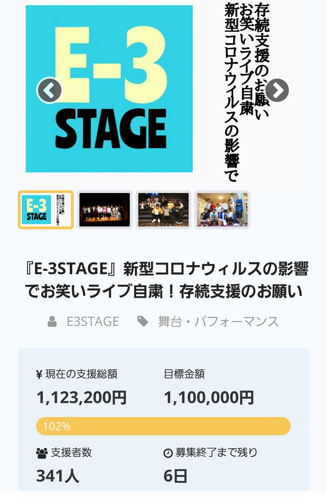 2020/06/14 02:02いつもお世話になっております。E-3STAGE主宰の榎谷敦司です。本日、目標金額の¥1100000を達成させて頂きました。達成出来たのも、リターンにご協力頂いた芸人さん、Twitterなのでリツイートのご協力頂いた方、そして今回のクラウドファンディングに、ご支援して頂いた、お客様、芸人さん、皆様のおかげで、達成する事が出来ました。誠に有り難う御座いました。まだ現状コロナウイルスの影響で、厳しい状況は続いてますが、現状ライブの存続は出来そう。今後のライブ再開については、コロナウイルスの影響もあるので、どうなるかは解りませんが、8月のライブ再開を目処にライブ準備をさせて頂きます。クラウドファンディング自体は、締切まで後6日有りますので、¥1500000達成時には、感謝の気持ちを込めて無料ライブを実施させて頂きますので、是非宜しくお願い致します。今回クラウドファンディングを達成させて頂いて、誠に有り難う御座いました。 もっと見る