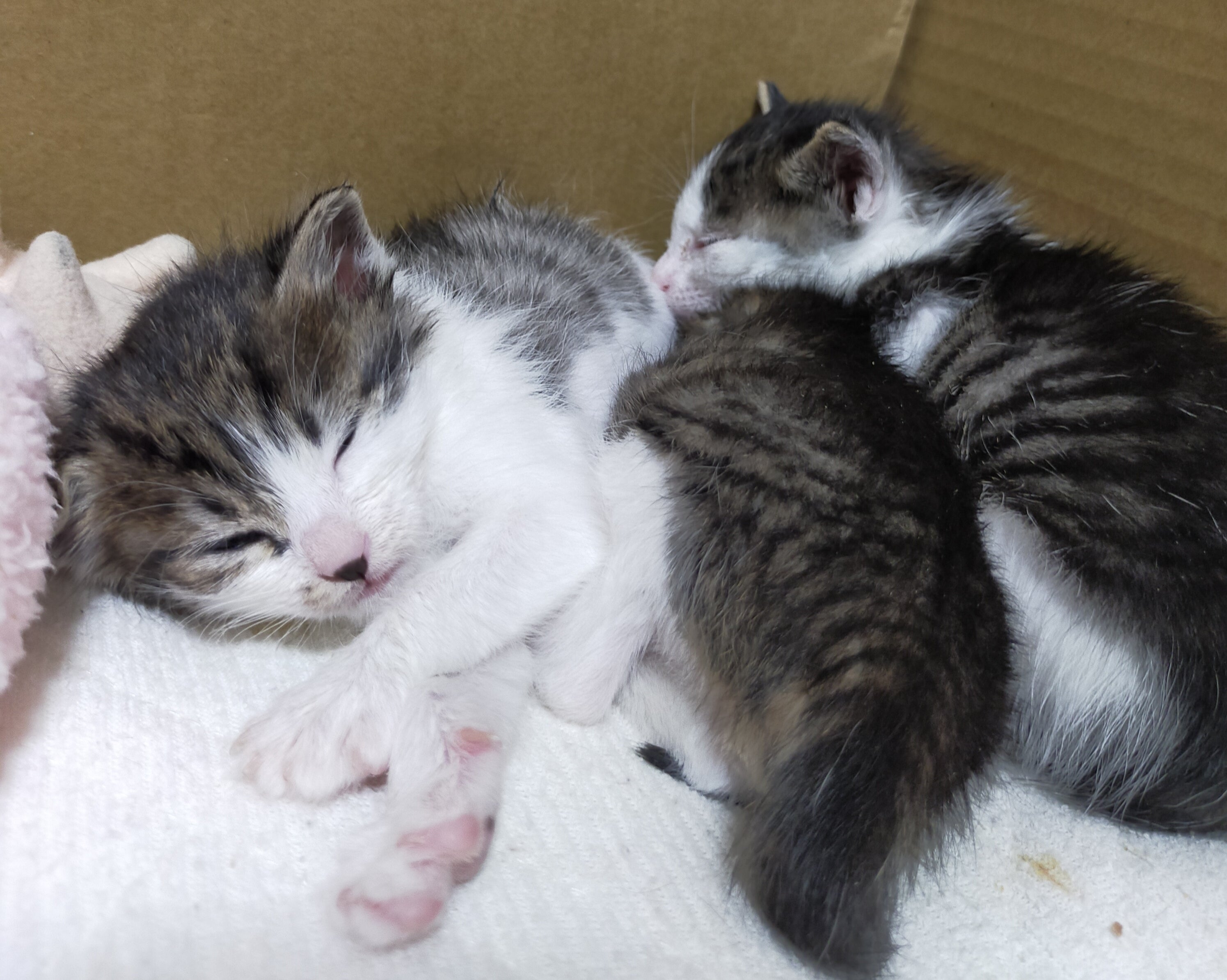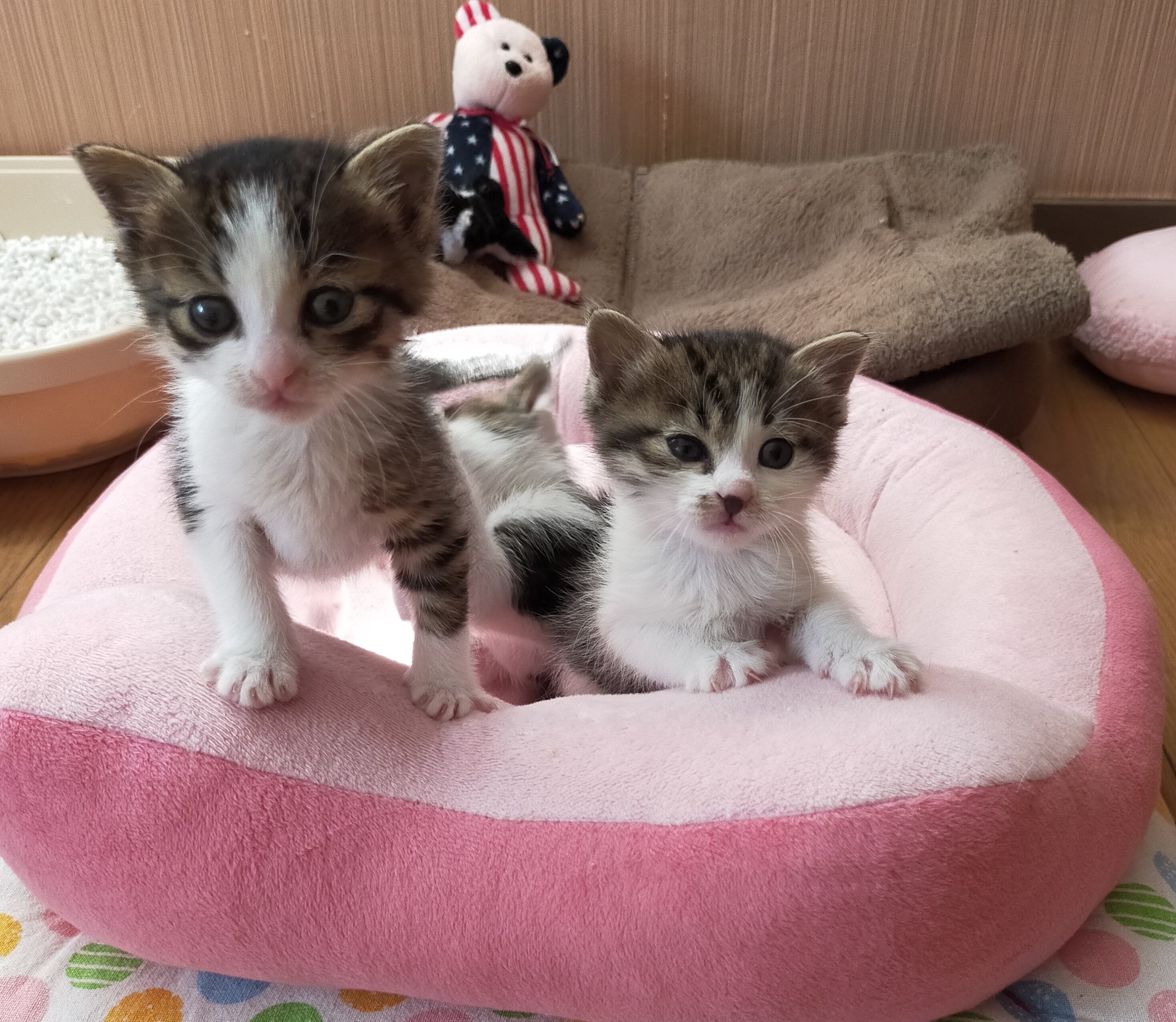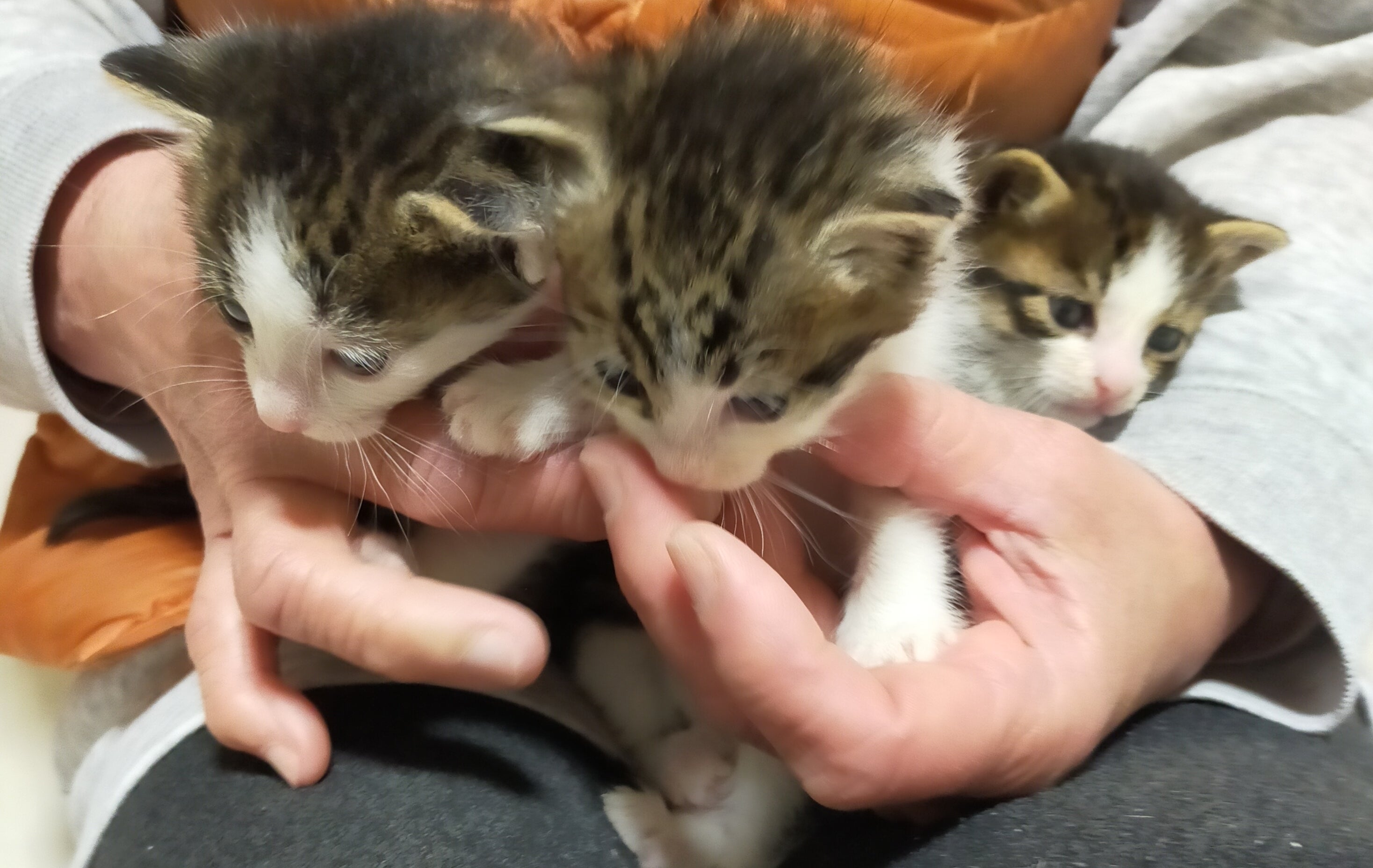 2020年4月6日、だいずの捜索時、とある駐車場内で微かに動く何かを見つけました。近づいたところ生後1か月に満たない程の3匹の子猫たちでした。だいずの脱走後ずっと猫さんを探して歩いてきましたが、このような形で子猫を目にすることはありませんでした。不審に思いつつ「近くに母猫がいるかもしれない」としばらく遠巻きに隠れて待ちましたが一向に現れず、カラスや虐待目的での連れ去りを危惧して、保護しました。すぐにかかりつけの獣医師に診察してもらったところ、発育状況からは母猫に育てられていたのだろうとのことです。一方、低体温に加え置かれていた状況から人によって捨てられた可能性があるとのことでした。
