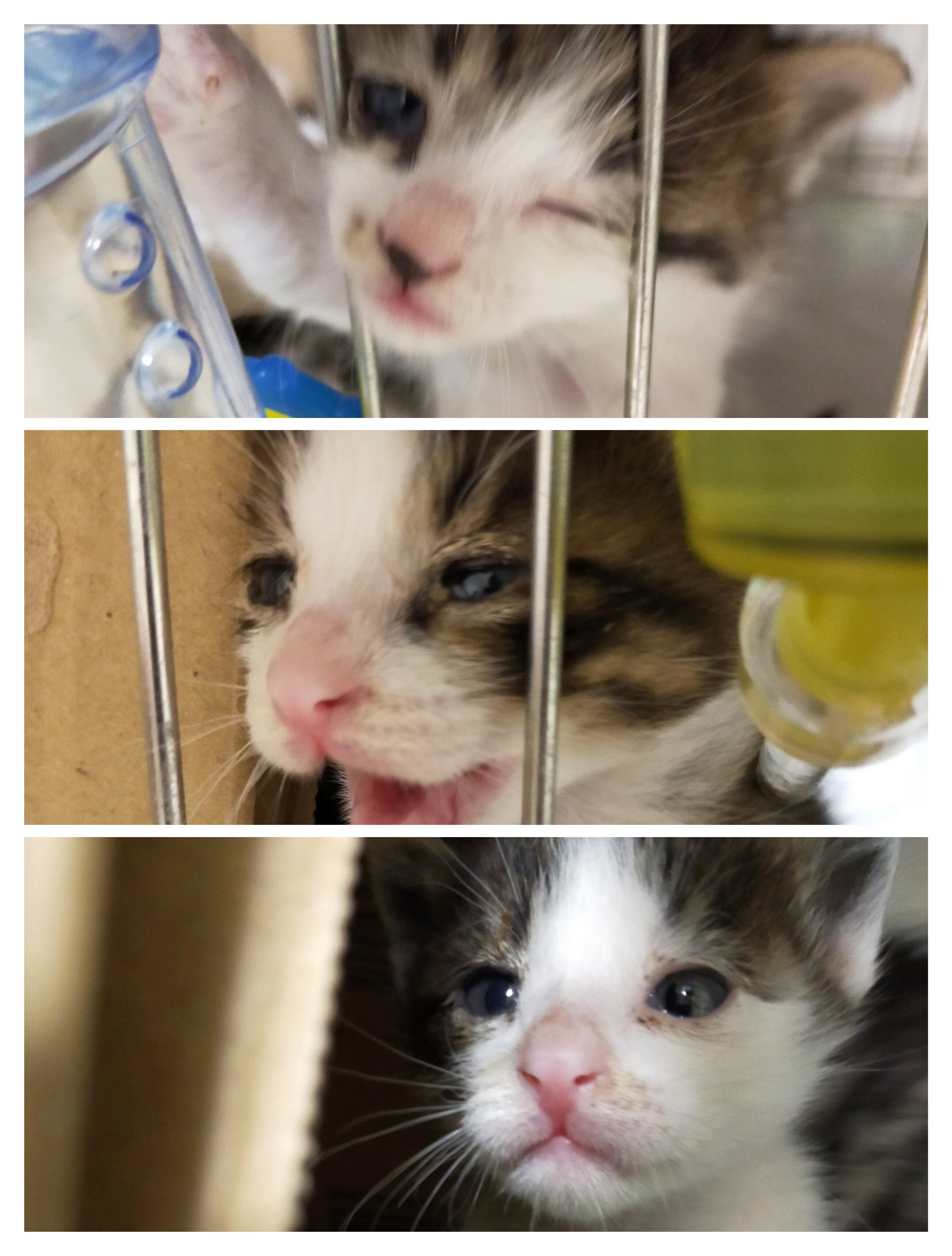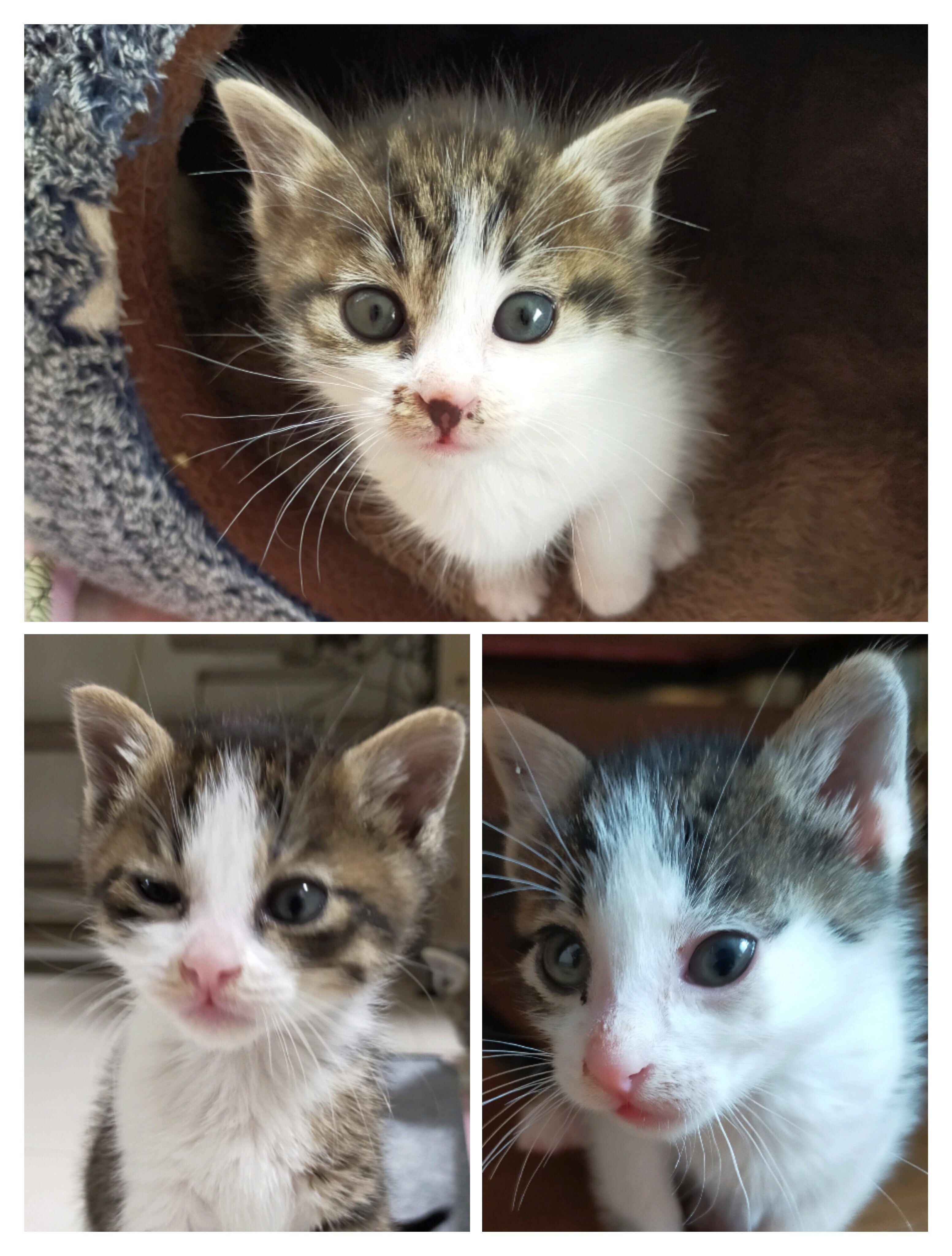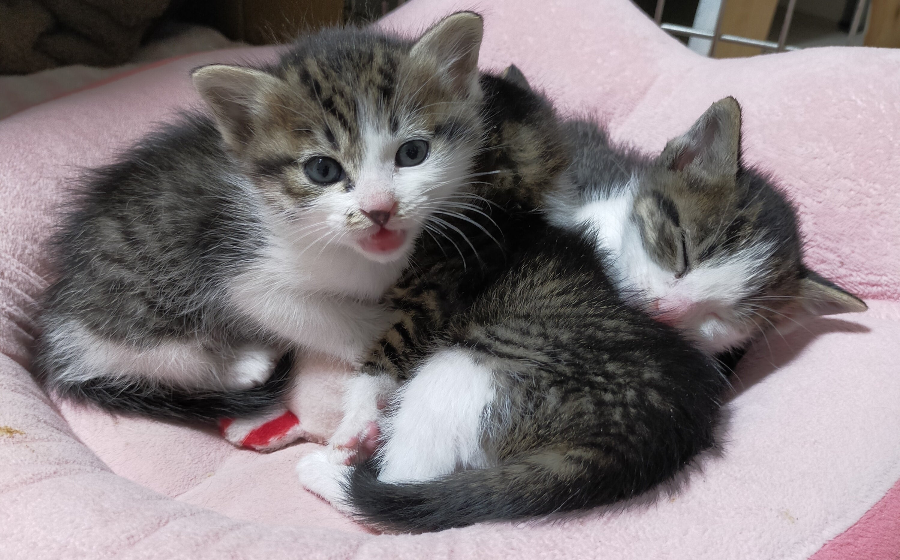 2020年4月6日、だいずの捜索時、とある駐車場内で微かに動く何かを見つけました。近づいたところ生後1か月に満たない程の3匹の子猫たちでした。だいずの脱走後ずっと猫さんを探して歩いてきましたが、このような形で子猫を目にすることはありませんでした。不審に思いつつ「近くに母猫がいるかもしれない」としばらく遠巻きに隠れて待ちましたが一向に現れず、カラスや虐待目的での連れ去りを危惧して、保護しました。すぐにかかりつけの獣医師に診察してもらったところ、発育状況からは母猫に育てられていたのだろうとのことです。一方、低体温に加え置かれていた状況から人によって捨てられた可能性があるとのことでした。