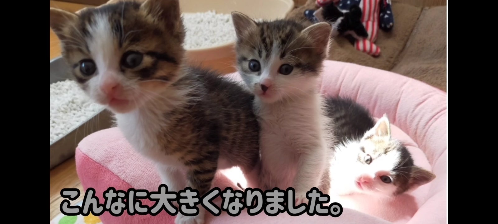 たとえ、目標が達成できなかったとしても、この子達を見捨てることは絶対にありません。訳も分からず連れてこられた我が家で、食べず、飲まず、動かず…当初は戸惑いや怯えの様子を見せていたこの子達が、今ではミルクをよく飲み、離乳食を食べることができるようになり、よく遊び、走り回り、ジャンプができるようになり、よくしゃべり、名前に反応するようになりました。出会ってまだ十数日、とても小さな体の3匹ですが、生命力に満ち溢れ、力強く、我が家にとってはとても大きく、かけがいのない存在です。