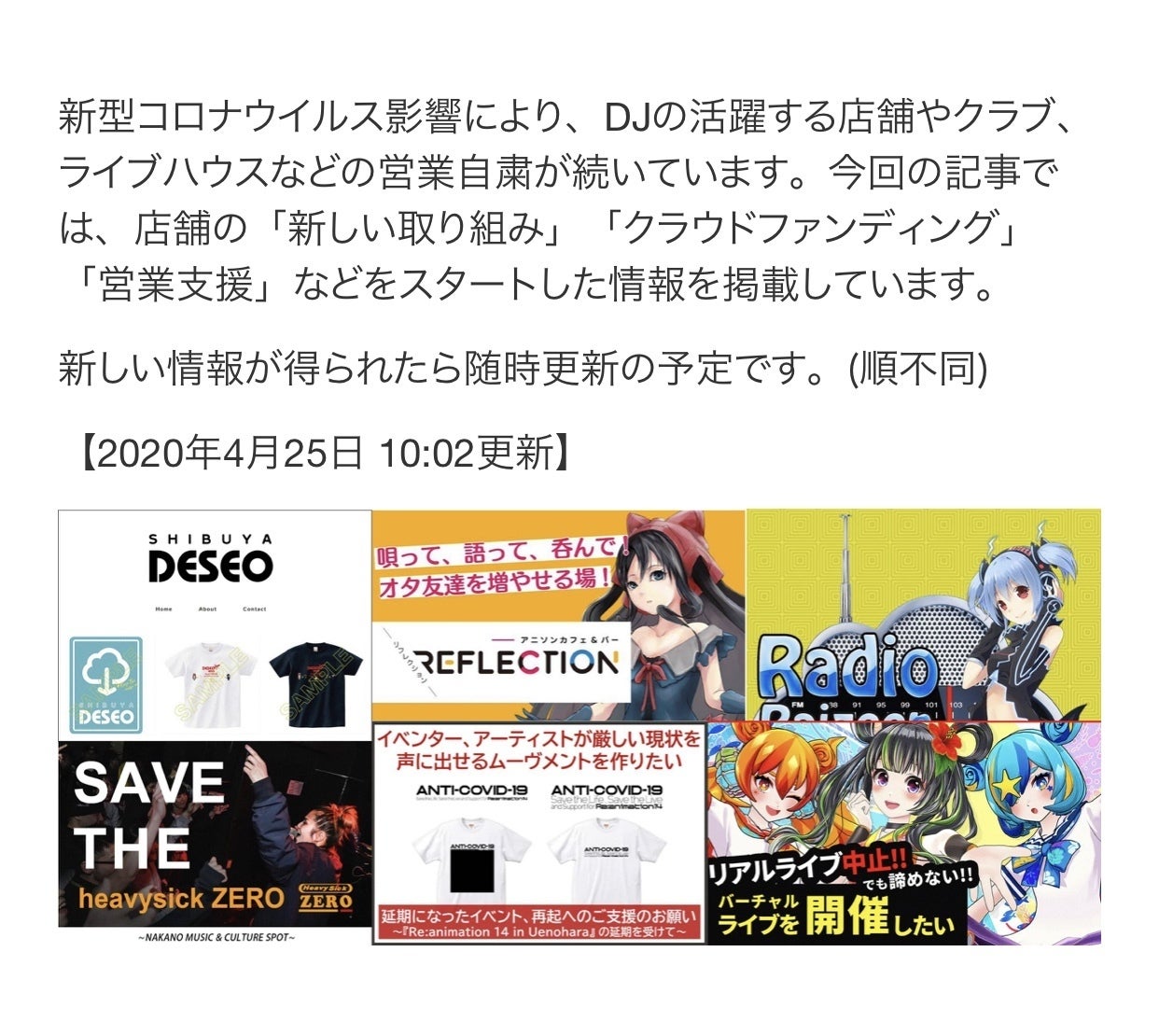 日頃大変お世話になっておりますアニソンDJメディア「アニイベX」様ニュース(新型コロナの影響拡大の中「新しい取り組み」「クラウドファンディング」「営業支援」を実施している店舗/企業/団体 情報のまとめ。)に掲載して頂きました。有難う御座います!!