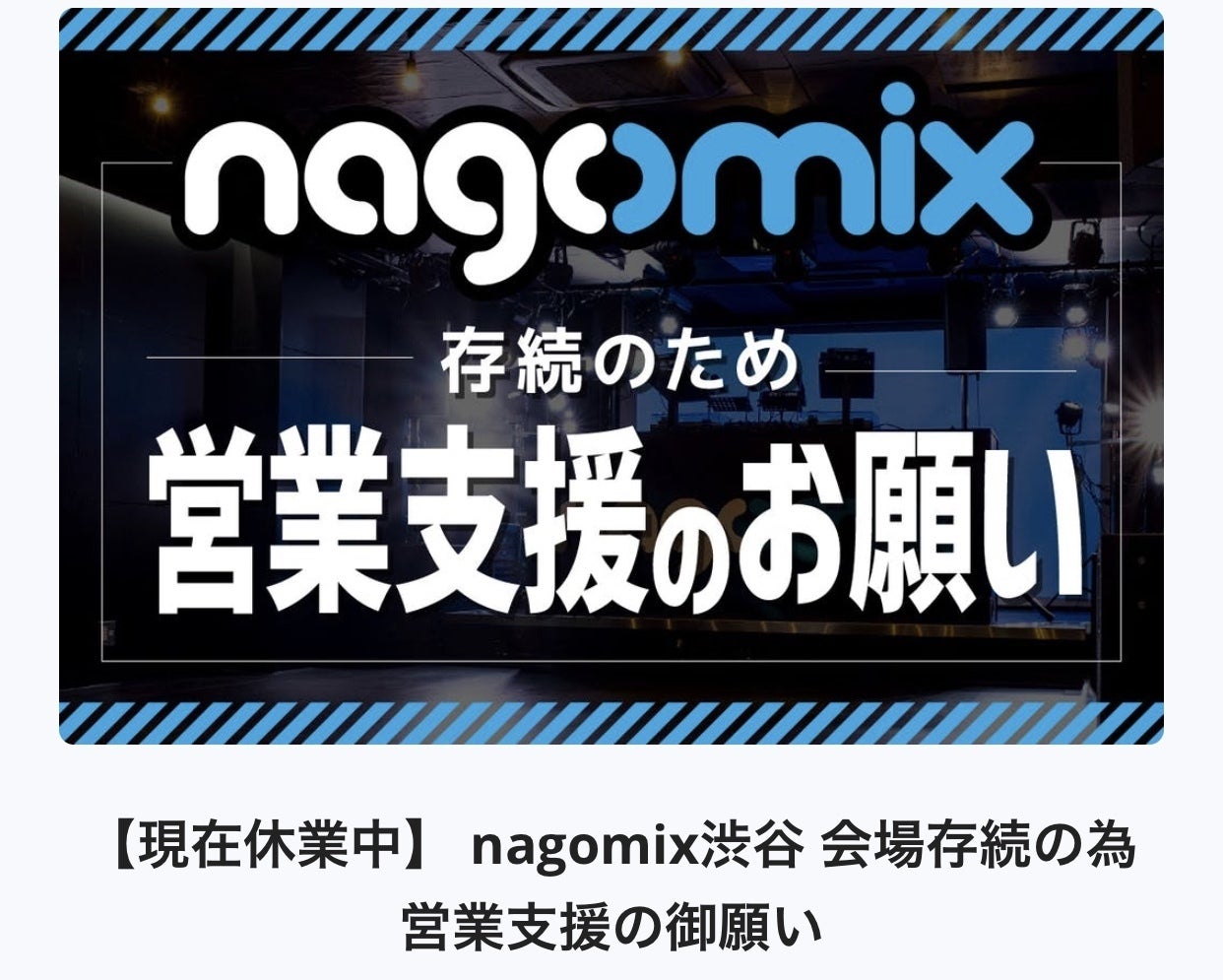 「nagomix渋谷 会場存続の為 営業支援のお願い」プロジェクト終了まで3時間となりました。本日23:59で終了となります。