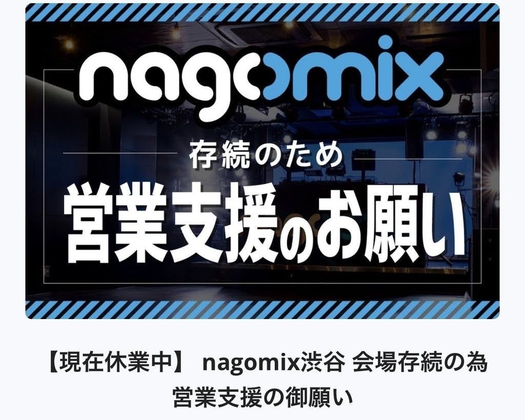 「nagomix渋谷 会場存続の為 営業支援のお願い」プロジェクト終了まで1時間となりました。23:59で終了となります。