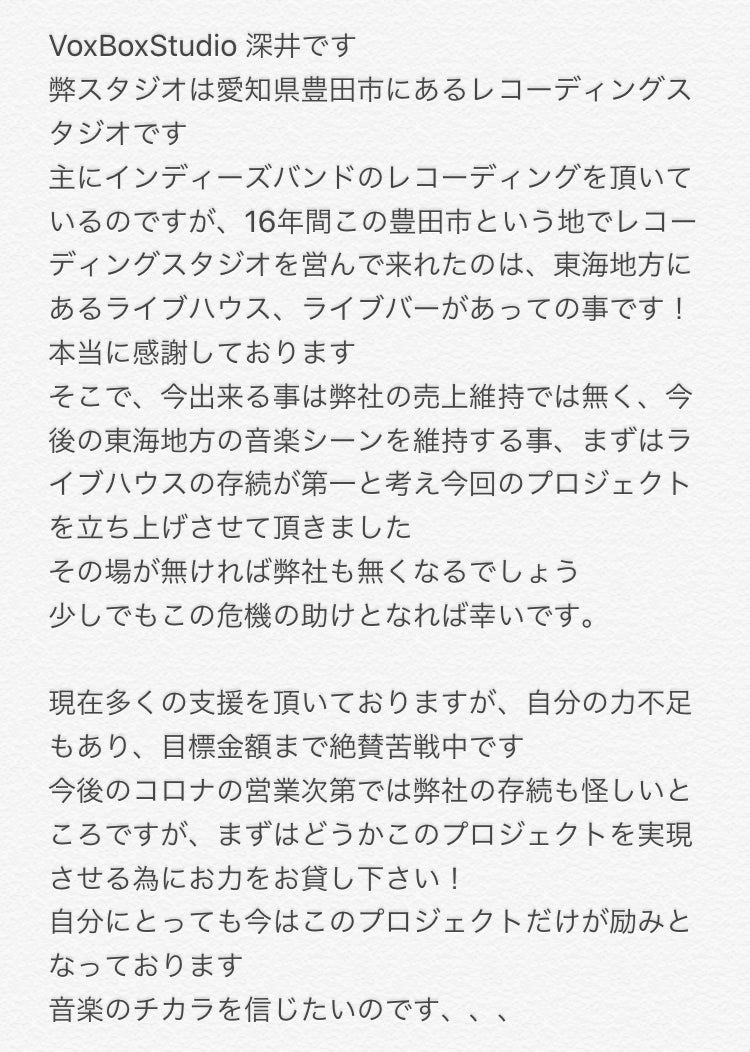 また完成CDはライブハウス等に配布しその売り上げを寄付金として活用していただければと思います。
