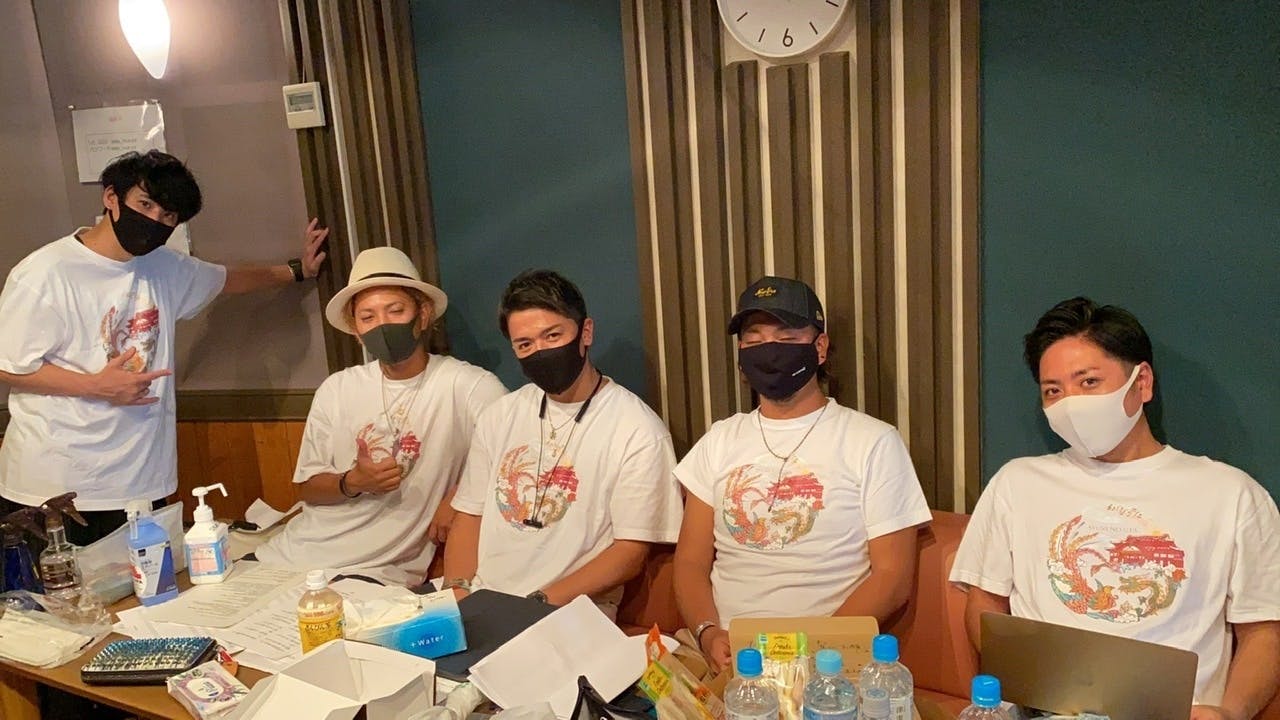 ようやくレコーディングとMV撮影はじまりました!まずはアーティスト男性陣、 SYURI NO UTA Tシャツを着て、今日の全体レコーディング前に一枚!