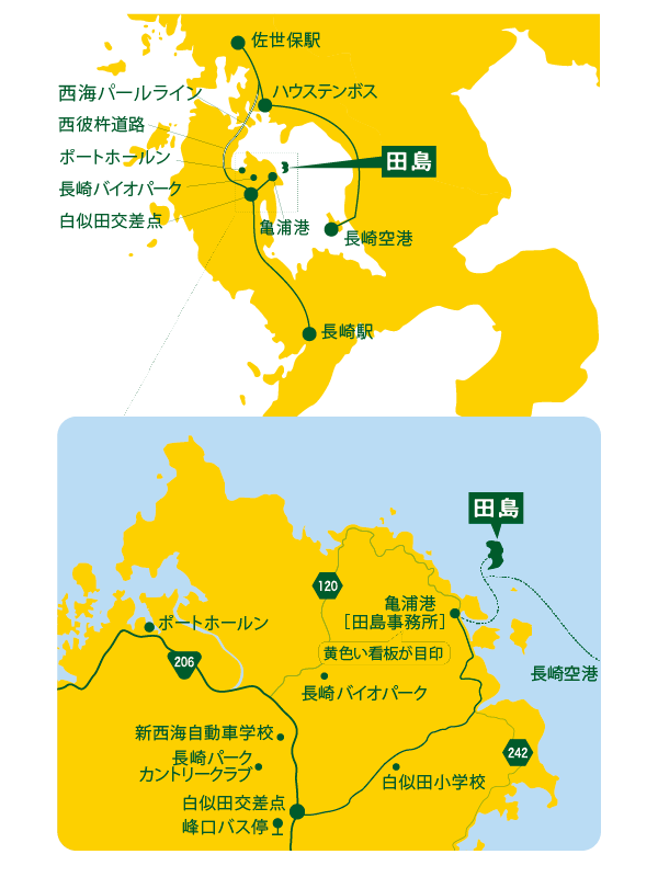 ※亀浦港の田島事務所で入島手続き後、船で無料送迎します。