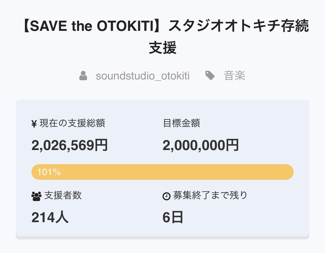 2020/05/16 16:03みなさんこんにちは。サウンドスタジオオトキチの浜野です。この度は「SAVE the OTOKITI」スタジオオトキチ存続支援にご協力・ご支援を頂き誠に有難うございました。お陰様で目標を過達し終了する事が出来ました。ご支援の総額は2,397,569円にもなりました。本当に有難うございます。 このコロナウイルス感染症では多くの方々が深刻な影響を受けています。お亡くなりいになった方々には心からお悔やみ申し上げます。この状況下で支援をお願いする事には抵抗があり、プロジェクト立上げ前には相当に悩みました。ですが、ウイルスに対する不安が払拭されなければ「商売にならない」状況が長く続く事を考え、周囲からの後押しもあり断腸の思いでお願いをさせて頂きました。支援をお願いする事に対する申し訳ない気持ちと同時に、もし反響が殆ど無かったら我々のスタジオが必要とされていない事を知らされる事になる。これまでやってきた事が否定されるかも知れない。そんな不安も相当にありました。スタートから1日程は怖くてサイトを覗けませんでした。そして、2日目から反響が広がりご支援はみるみると増え、暖かい激励のメッセージも沢山頂きました。その時確か100件程のメッセージを一気に読み、涙を堪えられませんでした。みなさん、本当に有難うございます。この感謝は一生忘れません。 収束までには相当な時間が掛かると言われています。営業を再開したとしても、感染騒動前の売上レベルに戻るのにどれだけの期間が掛かるのか。しばらくは気の抜けない舵裁きが必要となります。皆様に頂いた存続のチャンスを決して無駄にする事なく、かならず乗り越えて行きます。ご支援頂きました資金はスタジオの運営資金として大切に大切に使わせて頂きます。現在スタジオは営業自粛中ですが、営業再開時にはより皆様にご満足頂けるよう、交代で休みを取りながら毎日メンテナンスを行っています。この投稿の後、追記分として今日までの実施事項と今後の予定を報告させて頂きます。 重ね重ねになりますが、この度は多くの方々からのご支援を頂き誠に有難うございました。スタッフ一同スタジオオトキチをしっかりと守ってまいります。営業を再開し皆さまにお会いする事を楽しみにしています! もっと見る