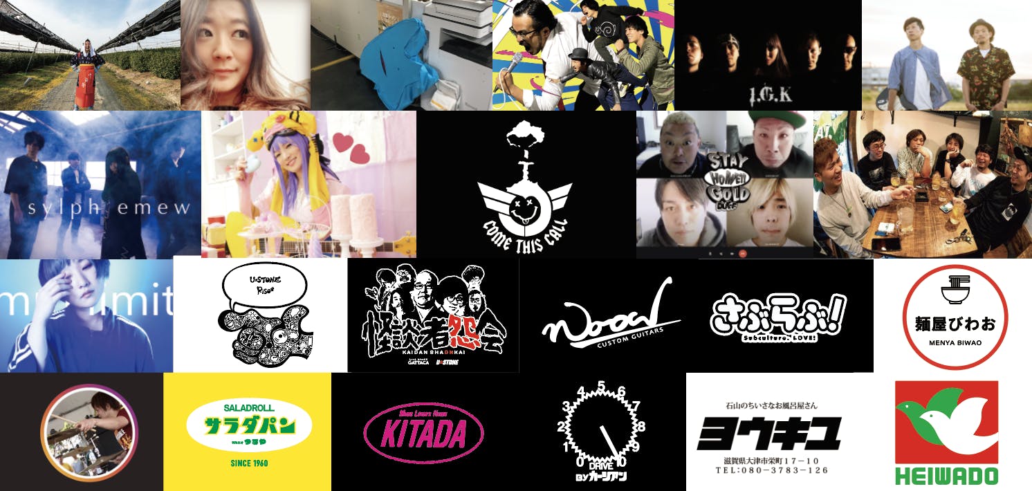 東狂アルゴリズム / ダブディフォー / 佐合井マリ子 / VOG / びわ湖くん / 伊谷亜子 / Altero Custom Guitars(tricot 中嶋イッキュウ氏デザイン)/ COME This CALL / DUFF / KarDiaN / Wood Custom Guitars / SKA FREAKS / つるやパン(サラダパン)/ さぶらぶ! / Riso# / キタダレコード / 1.G.K / こども社長 / 平和堂 / sylphemew / 怪談者怨会(三木大雲 / 松原タニシ / Apsu Shusei / 原昌和 / 下駄華緒 / 上里洋志 / 田中俊行)※京都GATTACAとコラボ企画 / 蓉輝湯 / mm limit / 麺屋びわお