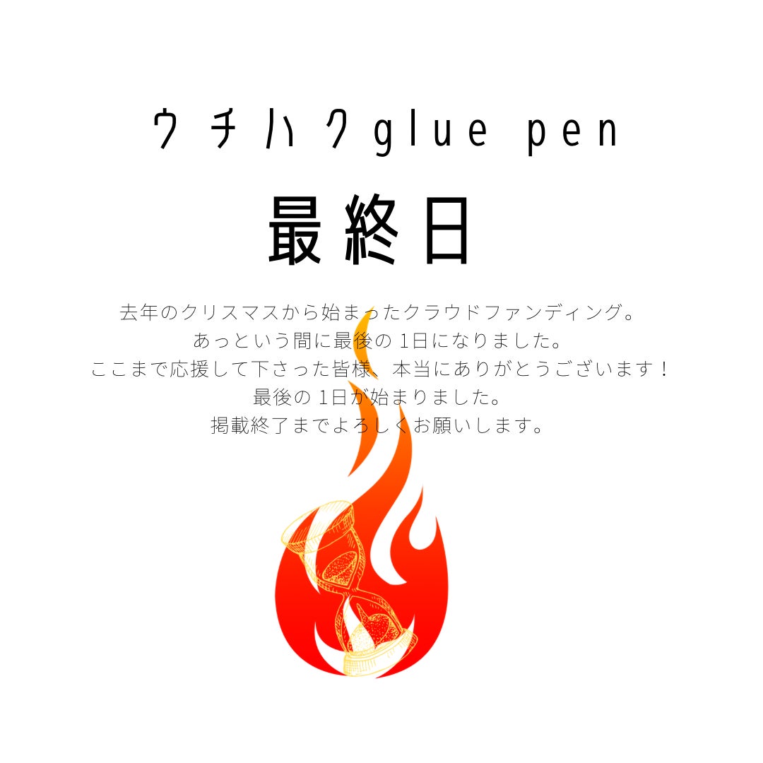 おかげさまでウチハクglue penクラウドファンディング、最終日を迎えることができました!ここまで応援いただいた皆様本当にありがとうございますm(_ _)m明日からはリターンの発送準備を急ピッチで進めていきます。あと数時間だけお付き合い下さい。