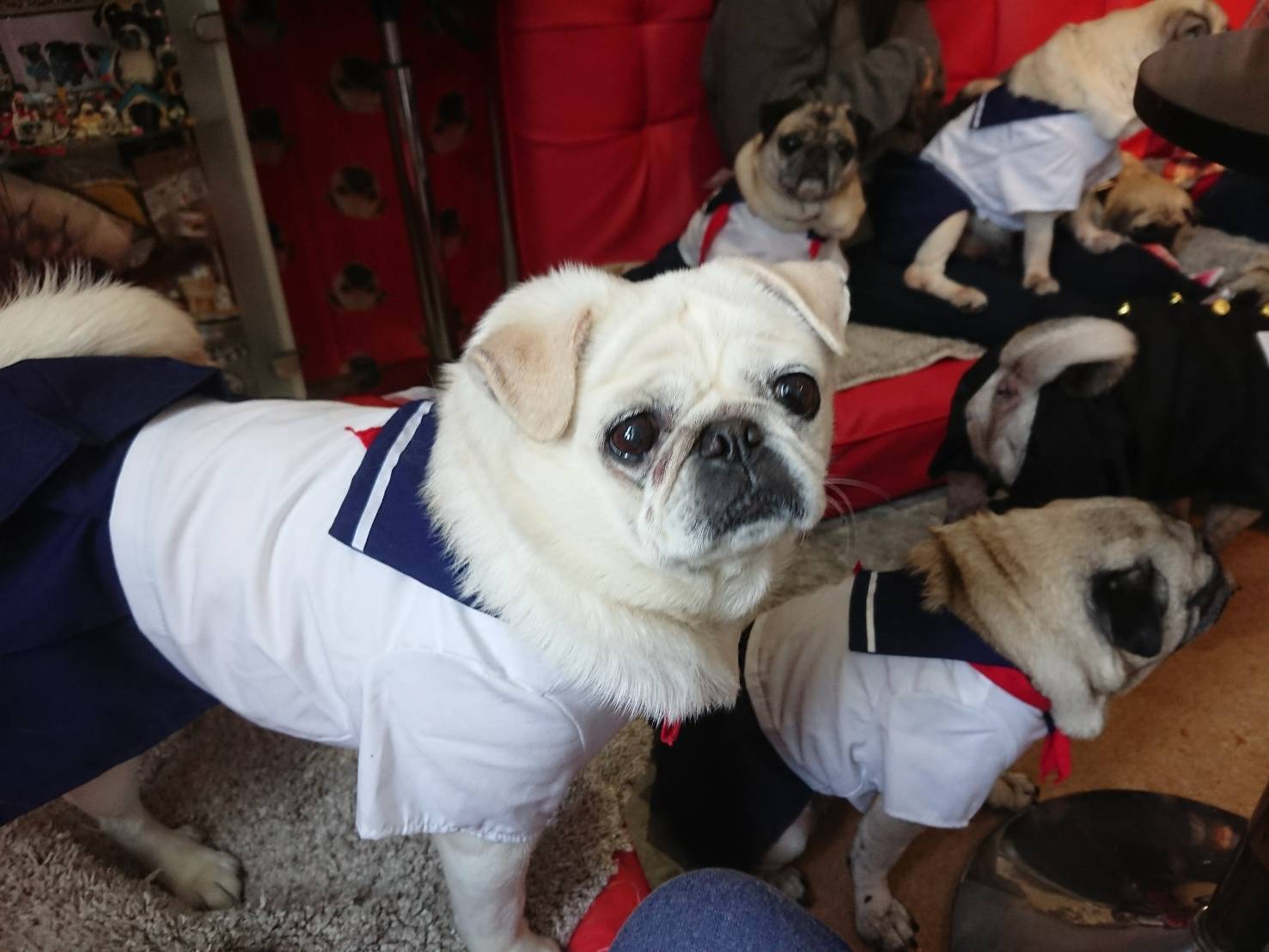 パグ命!のパグ犬マニアで『愛犬の友』さんにも取材された、毎年春と秋に100頭近くのパグが集まるドッグラン貸し切りBBQ&パグリンピックオフ会など企画する京都パグ会を主宰し、愛玩犬のパグの魅力を世の中のもっとたくさんの人に知ってもらいたい!という思いから、趣味で飼い犬の親子5世代のパグ17頭(生後2ヶ月~15才まで)と触れあえる、知る人ぞ知る全世界・全国からのパグマニアが訪れる癒し処、京都の『パグカフェliving room』のオーナーです。珍しい白パグやミニパグ(4~5㎏)もいます。今は5世代目の孫やひ孫にあたる可愛い盛りの生後2ヶ月のパピー4頭がいます!去年は、最愛の娘達(ミニパグあっちゃん12才・プリン11才)を相次いで亡くし突然のお別れで背中を押されるように、以前からやりたかった保護犬活動もはじめ、廃業のブリーダーから、10年間ベッドもないコンクリートの部屋に閉じ込められ、名前も散歩も可愛がられる事もなく、何の楽しみもない子供を生むだけの道具として扱われてきた、医療も受けることなくハゲハゲで目も耳も皺もドロドロ、歯もボロボロの爪も魔女のように伸びゾンビみたいな姿で、死んだ目をした暗い顔の繁殖リタイア犬2頭をレスキューで受け入れました。もともとの性格が良く、すぐにみんなとも仲良くなり、今では見違えるほど可愛くなって輝く笑顔で残りの犬生をパグカフェでみんなと一緒にたくさんの方々に愛される日々を堪能しています。