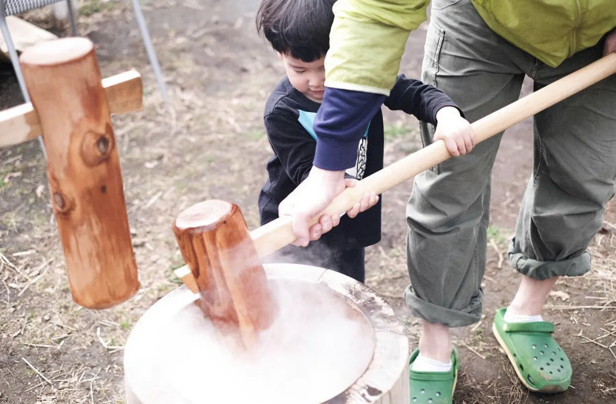 年数回開いた「海山バザール」というイベントでは、地元のお米屋さん協力のもと、子どもたちを中心にお餅つき大会を開きました。大人も子どもと一緒に和気藹々とお餅つきをする様子は、活気に満ち溢れ、地域ならではの温かみのある輪が広がりました。