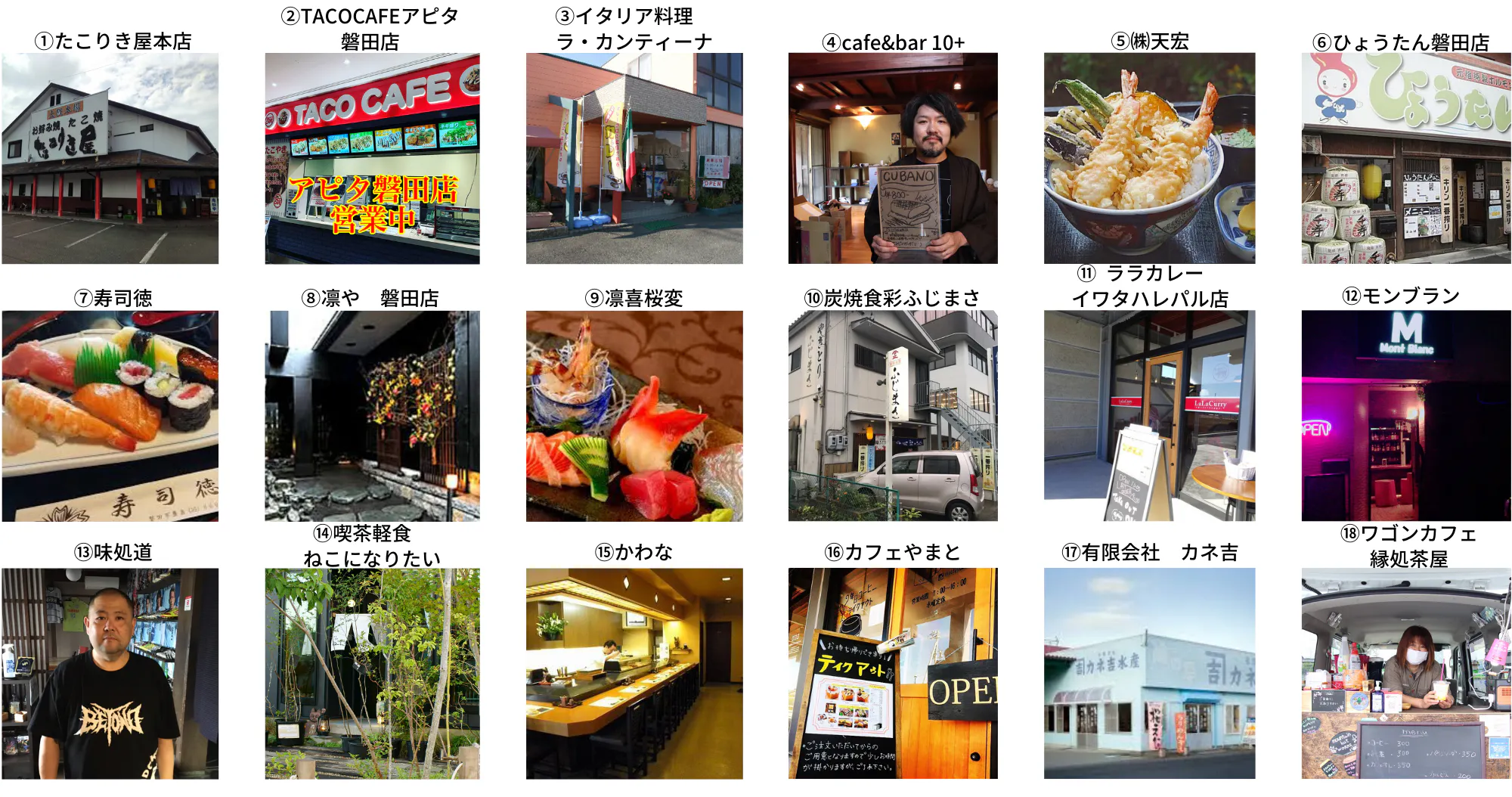 ④cafe&bar 10+⑤(株)天宏⑥ひょうたん磐田店⑦寿司徳⑧凛や 磐田店