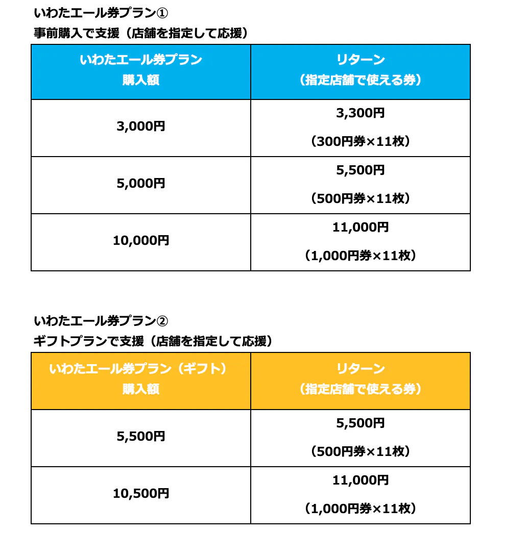 ※エール券リターンについては、上記クラウドファンディングいわたエール券参加店舗の中から店舗を指定してください。上記以外の店舗の指定は、エール券の発行が出来ません。ご了承ください。