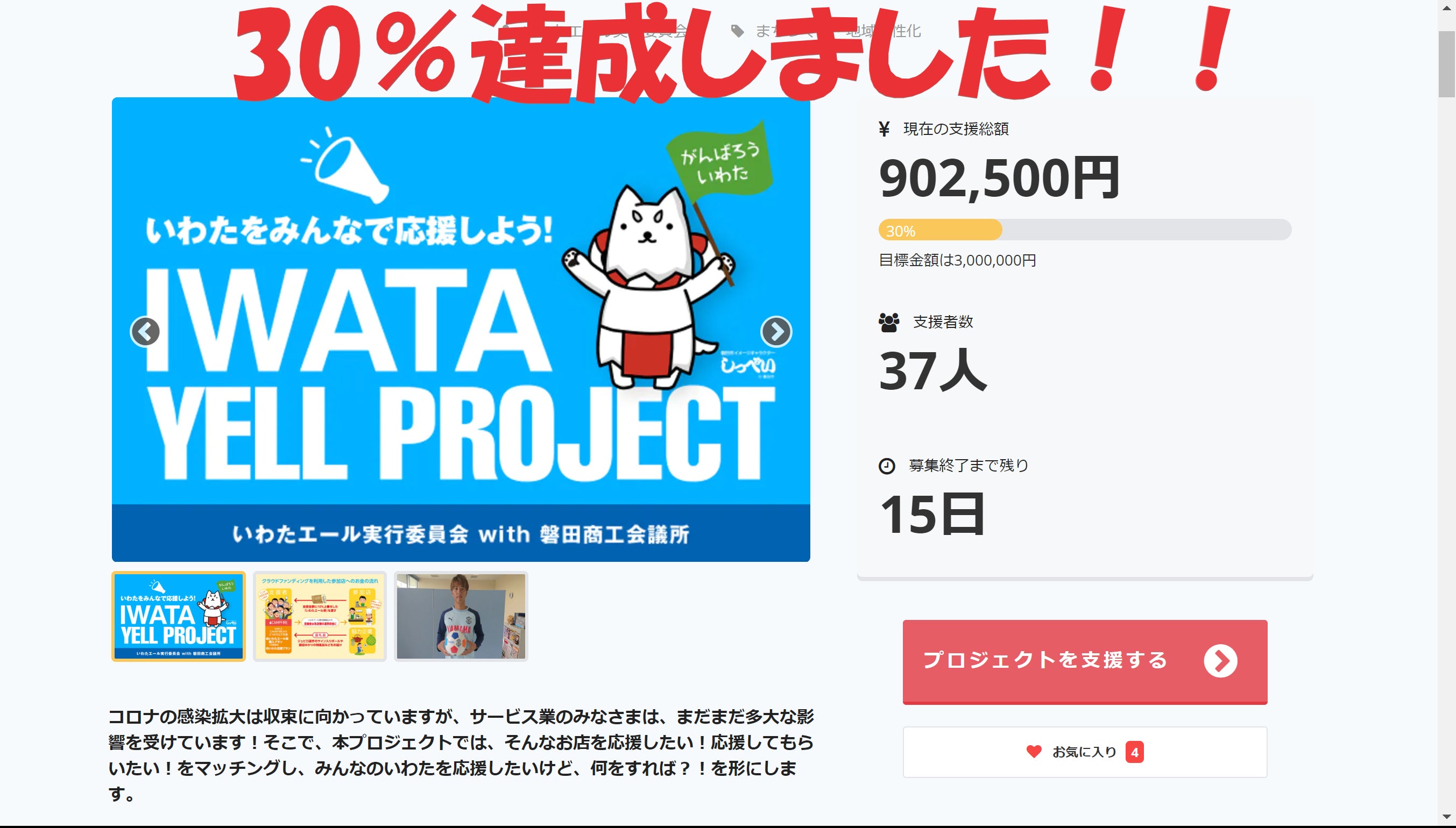 皆様のおかげで、30%まで達成することができました!