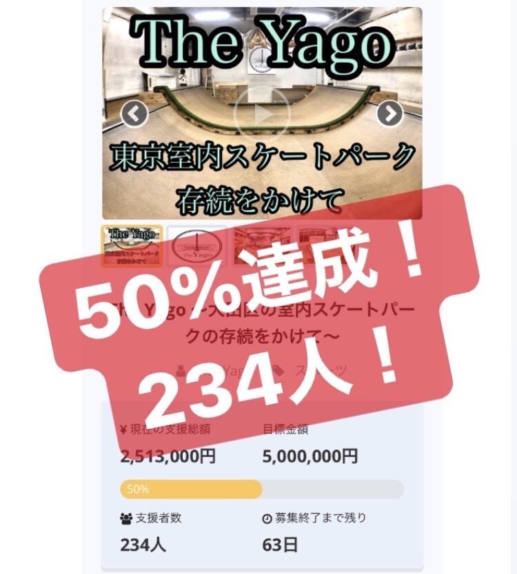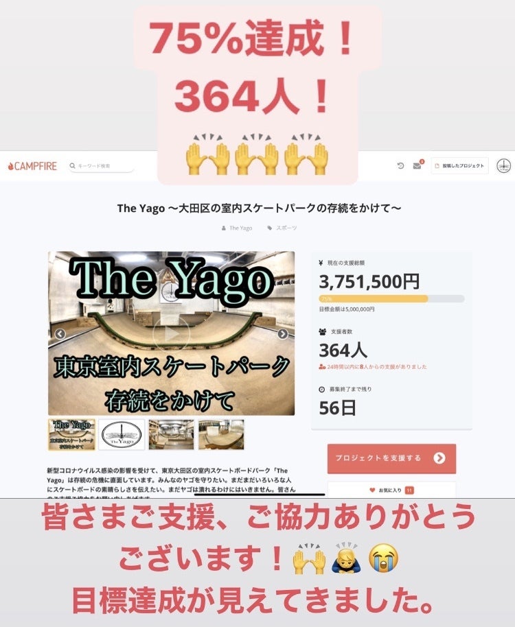 皆様沢山のご支援、応援メッセージ等本当にありがとうございます。87%まできました!コロナの感染率も徐々に下がってきて危機感が緩み始めていますが、油断はしないように日々の生活を十分に気をつけましょう。再開後も意識を緩めず皆さんが健康であり続けて楽しくスケートボードできるように、その時にこの場所があるようにまずは自分が健康でなけれダメだと思います。心も体も健康であるように自分も日々意識して気をつけながら生きています。皆様とまた会えることを楽しみにしております。目標達成まであと13%ですが引続きよろしくお願いいたします。