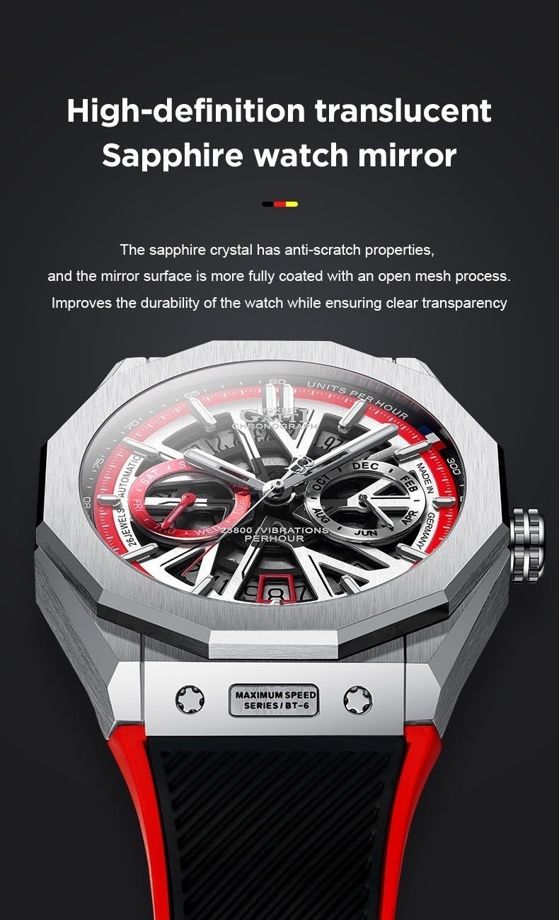ダイヤモンドに次ぐ硬さのため文字盤に傷や汚れがつきにくく、ムーブメントを外部のハードな衝撃からもガードするのでもう手首を気にする必要はありません。