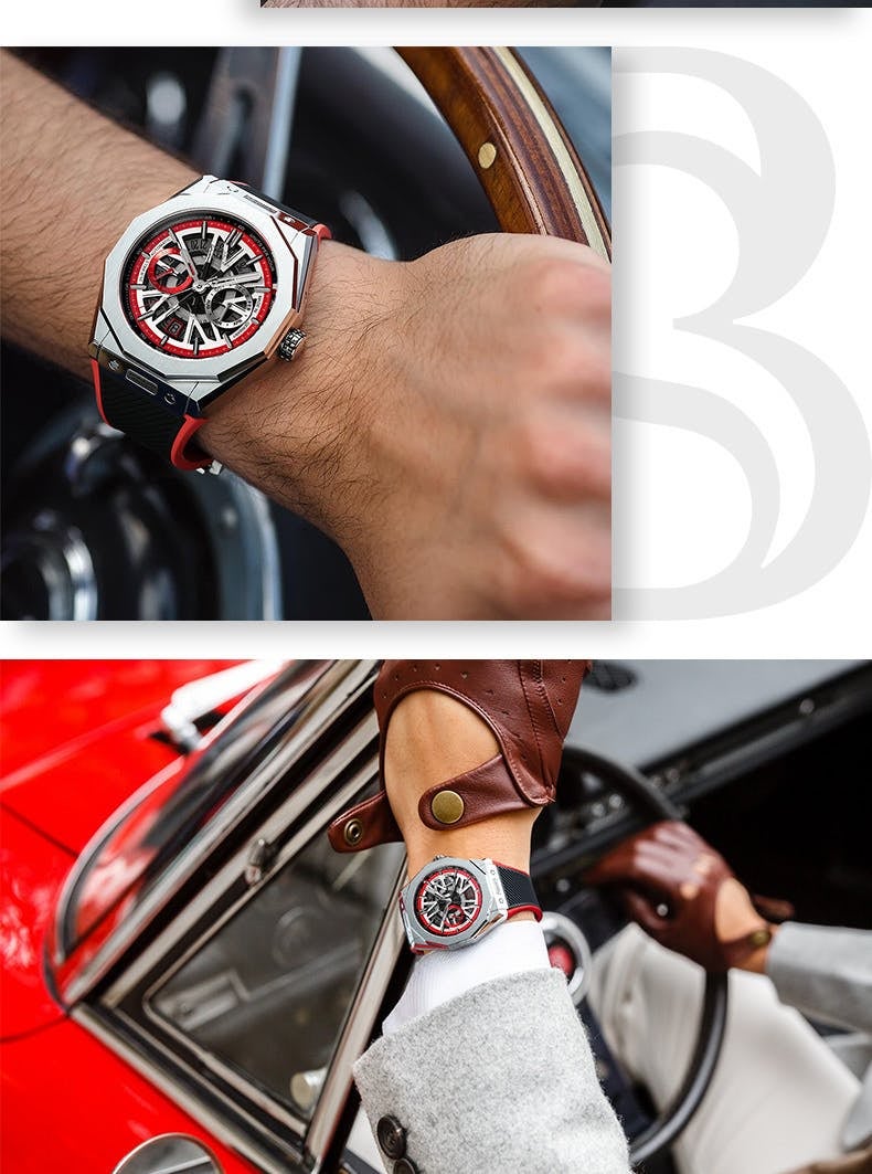 一般のユーザーには、一見同じに見えてしまいがちな自動機械式時計のなかで、スーパーカーモデルならではの個性を、目に見えるデザインという形で表現する必要がある。
