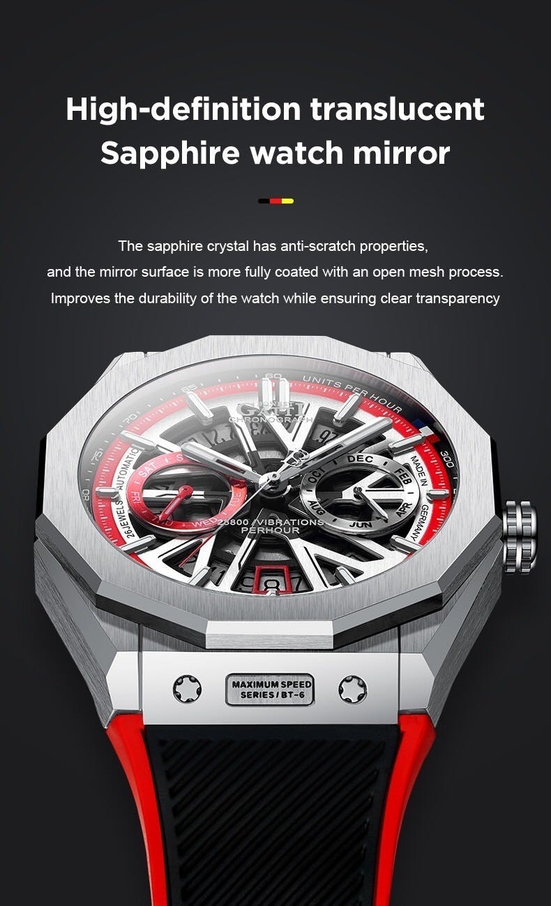 これぞ、スーパーカーのガラスやミラーにも採用されている自慢の高強度なサファイアクリスタルミラー。時計を装着していて気になるのが毎日、使用を繰り返すうちにできる傷や汚れ。だからこそGATTIは、風防に「高純度のサファイアガラス」を採用。