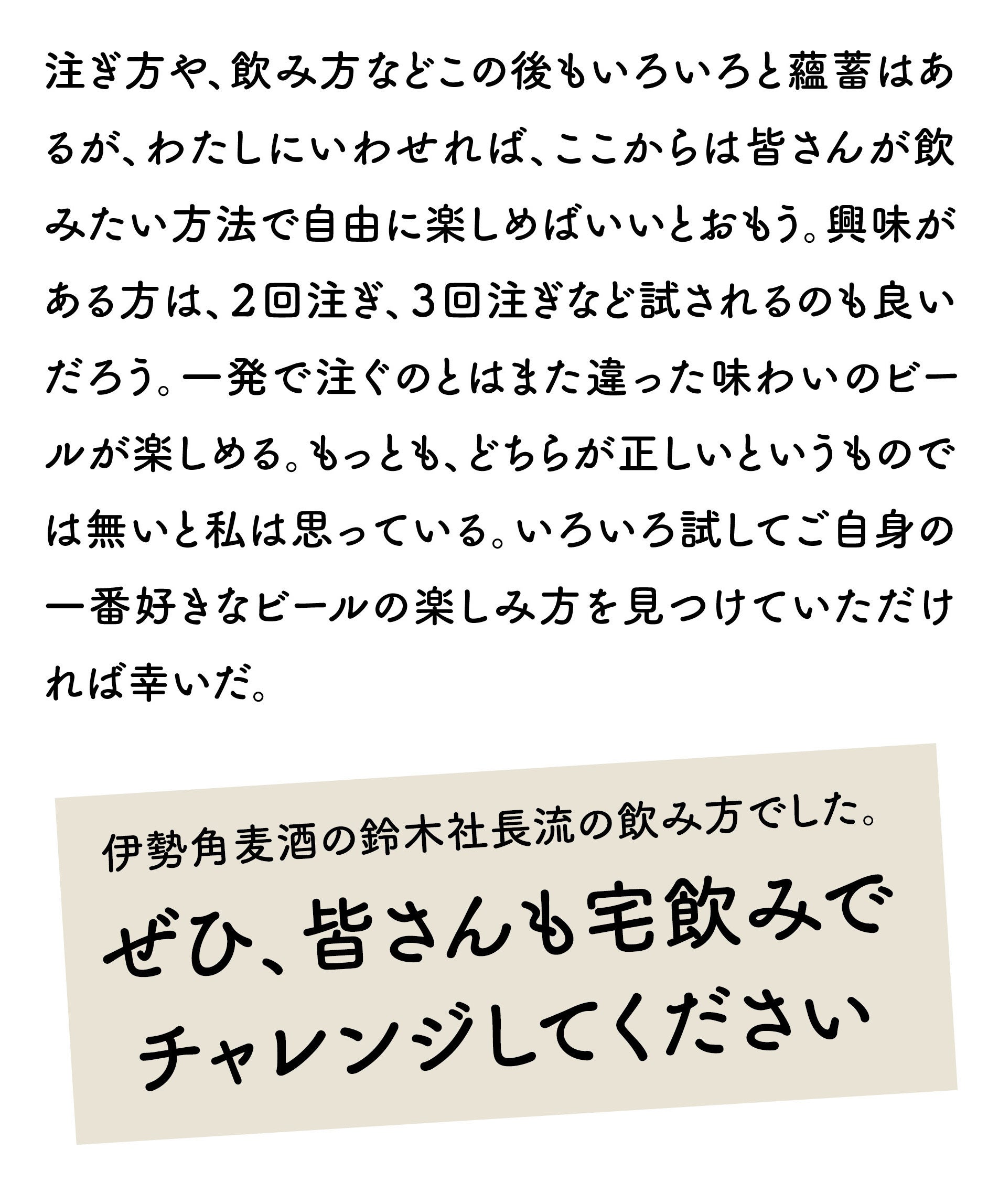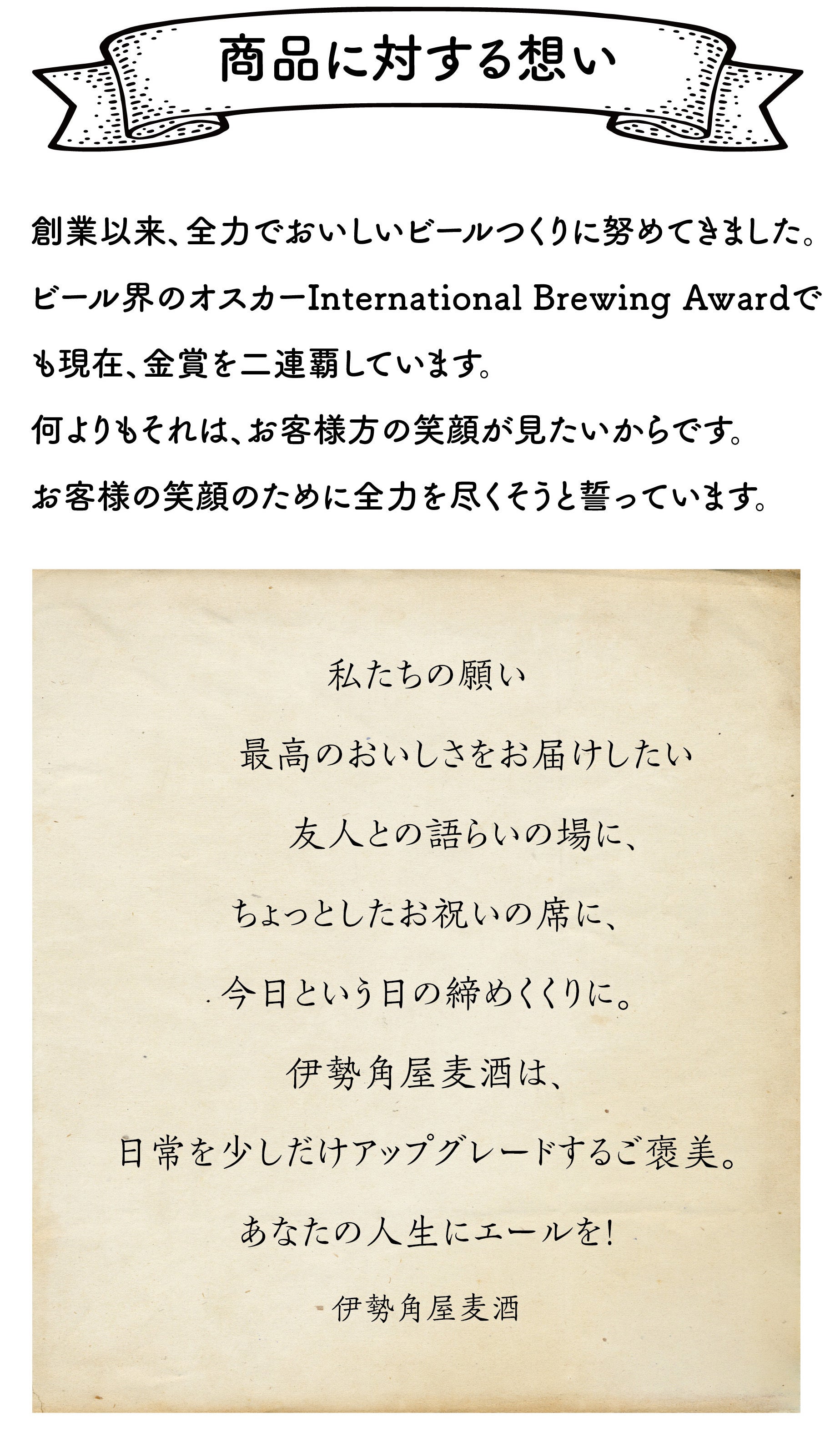 ファンの方々には、伊勢角屋麦酒を代表する銘柄として『イセペ』と呼んでいただいています。1997年にビール造りをはじめ、最初に仕込んだビールがペールエールでした。2003年にわたしたちがはじめて国際大会で金賞を受賞たのも、International Brewing Awardではじめて金賞を受賞したのも、全てこのペールエールで、わたしたちにとってひときわ思い入れの強いビールです。