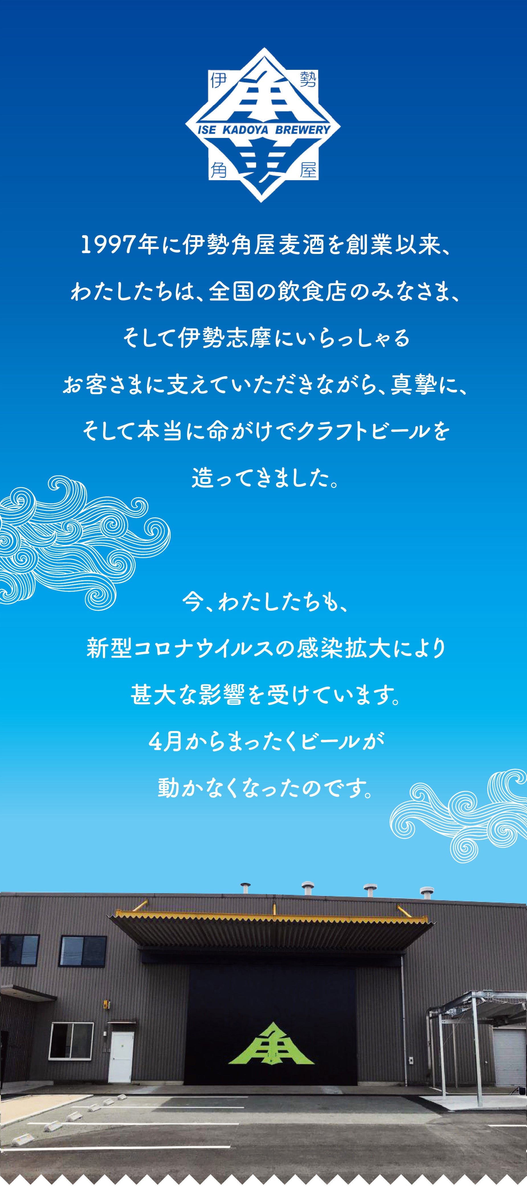 三重県伊勢市の鈴木成宗(なりひろ)と申します。1575年創業の老舗餅屋の21代目をしながら、微生物好きがこうじて1997年にクラフトビール伊勢角屋麦酒を立ちあげました。良いものをつくり世界を唸らせたいという子供じみた考えで長年ビール造りを続け、世界大会で受賞しては、無邪気に喜んできましたが、今回の新型コロナウイルス禍に際しては、全国から多数の励ましのお声をいただき、人の温かさが身に染みております。 仕事を通して、必ず社会に恩返しをしたいと思っています。 せめて、私たちのビールで、ふさぎ込みがちな世の中に少しでも笑顔を取り戻すことができれば幸いです。