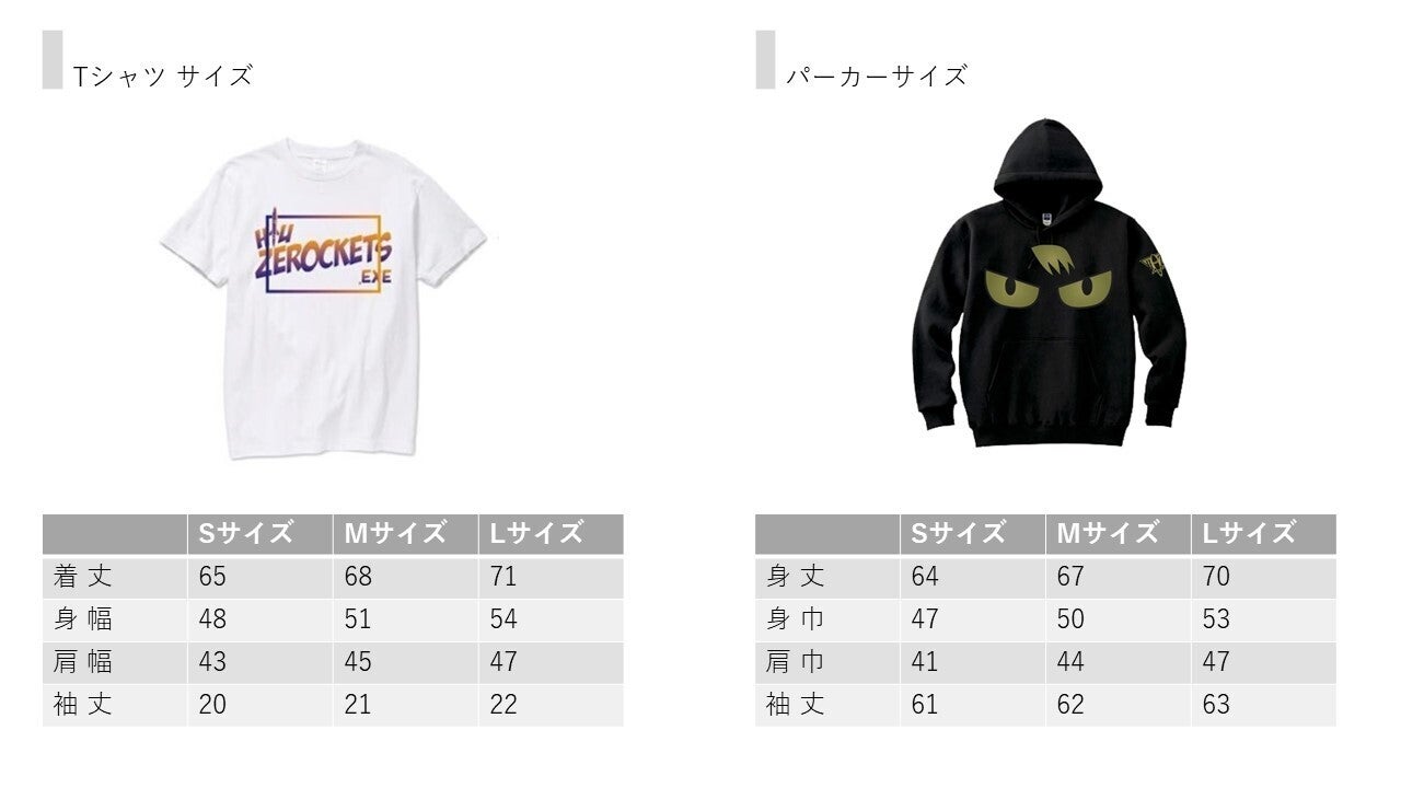 Tシャツとパーカーの着幅・着丈等の詳細に関しては以下サイズ表をご参照ください。