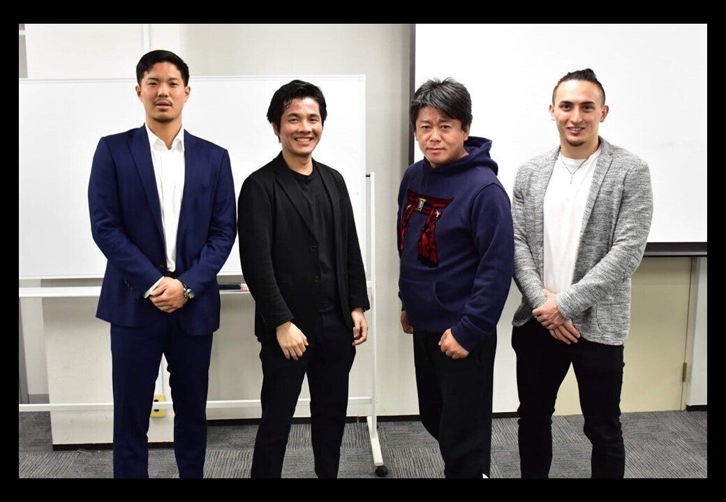 オーナー(右:堀江、左:柏井)と選手(右:佐藤、左:秦)